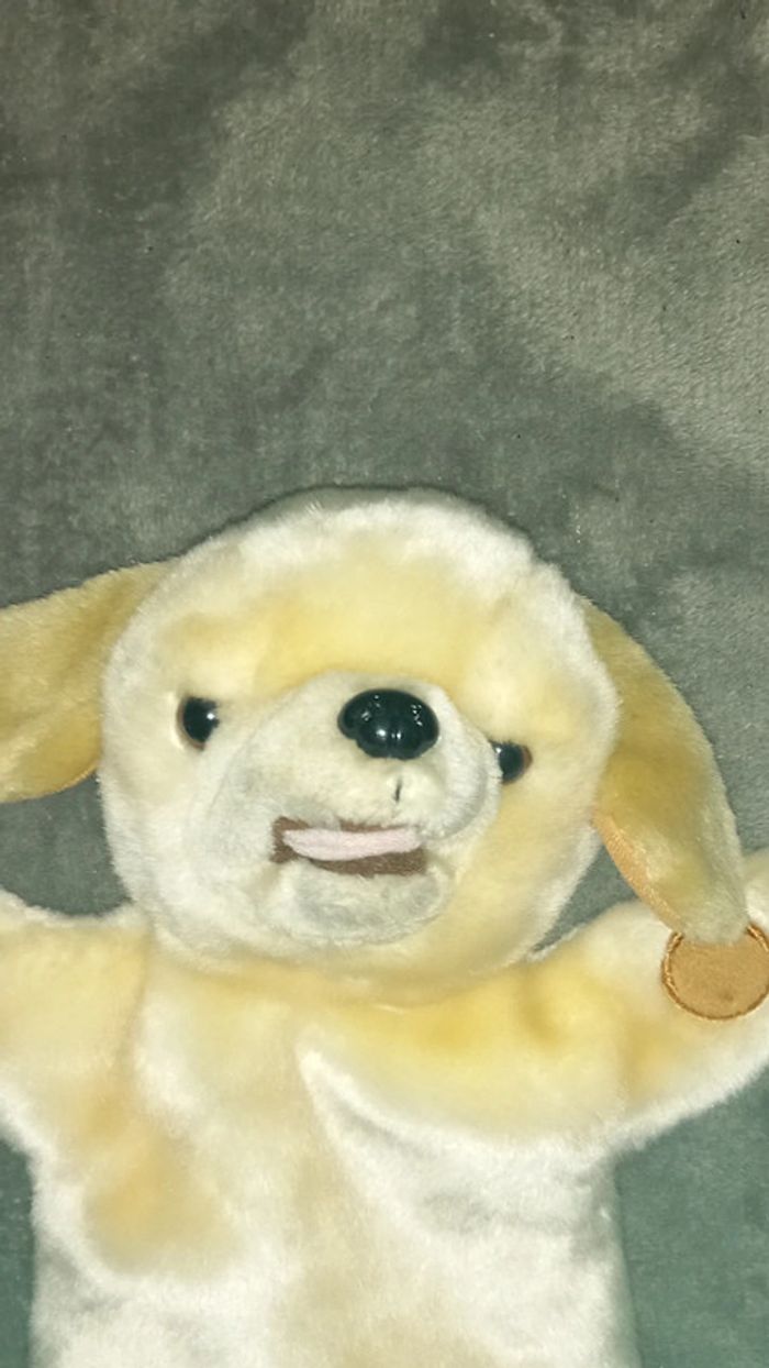 Doudou marionnette jaune aux yeux billes au toucher très doux en le regardant on dirait un vrai Hauteur : 34 cm Marque : Puppet Buddies Neuf sans étiquette