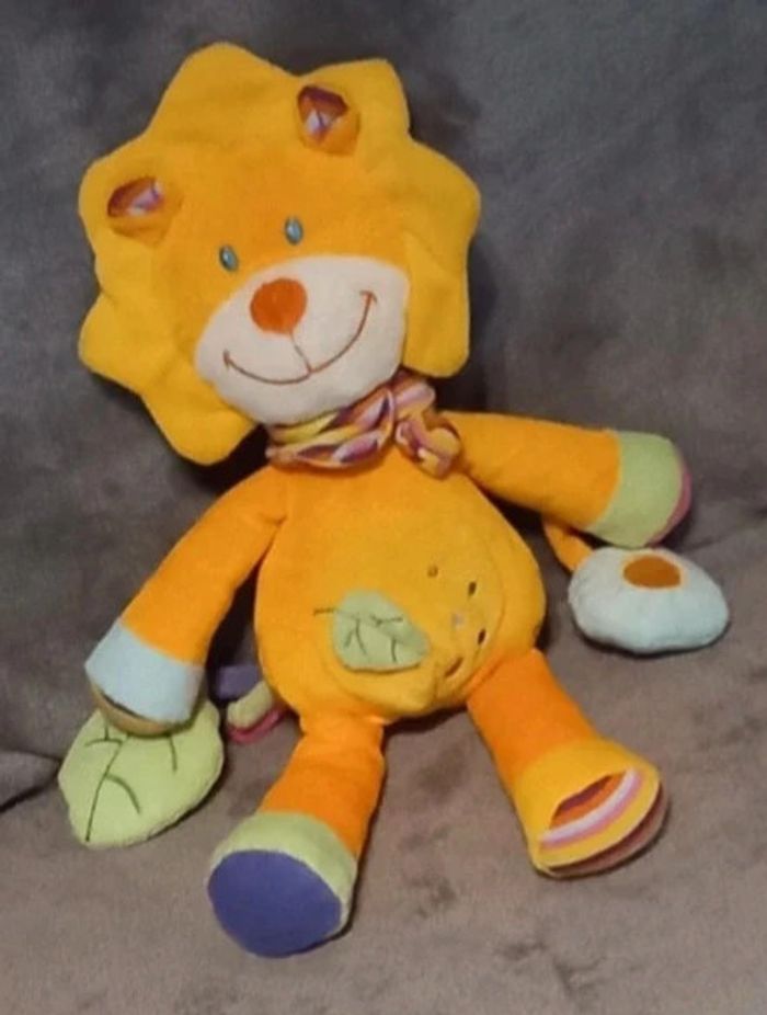 Doudou peluche lion en velours de couleurs jaune et orange avec bruit hochet et motifs sur le doudou et une feuille sur la pâte du lion et un soleil de l autre Une écharpe à rayures Hauteur : 30 cm Marque : Pommette État neuf