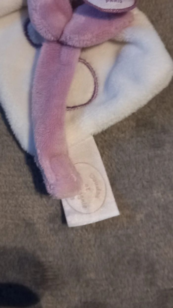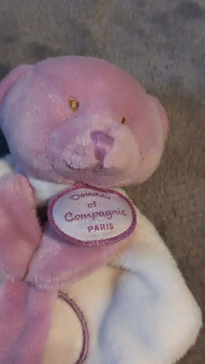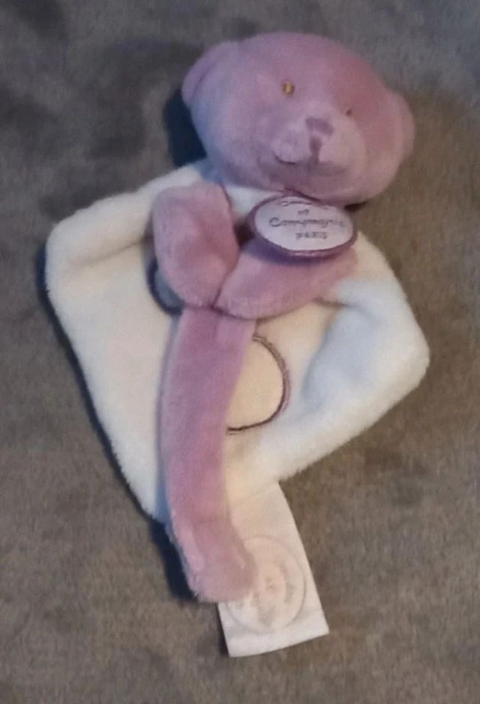 doudou ours en velours de couleurs rose avec petit mouchoir blanc et 2 cercles rose avec attache tétine Hauteur doudou : 12 cm Marque : Doudou et compagnie