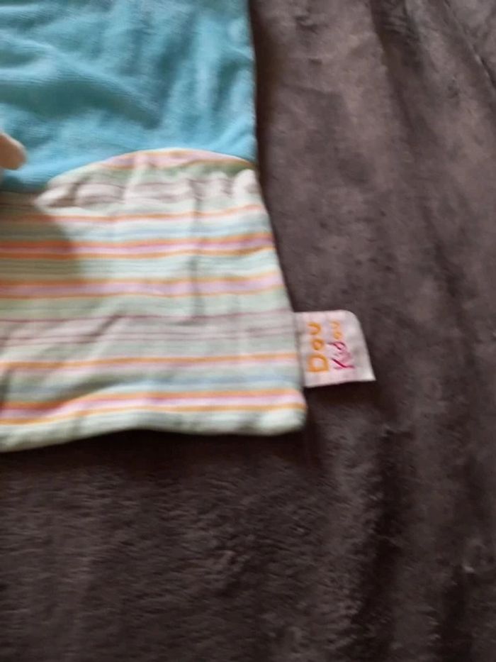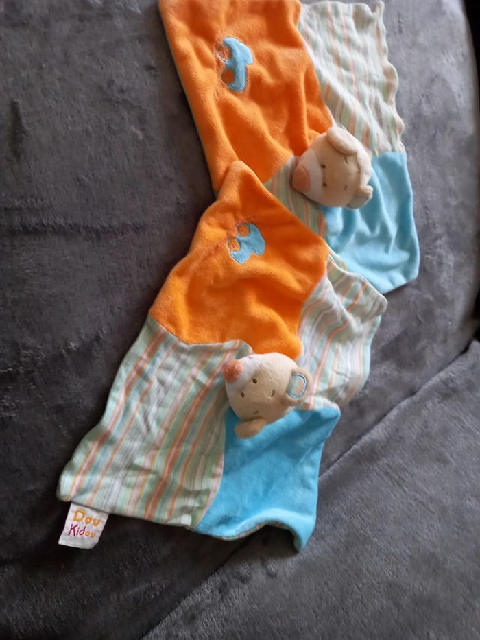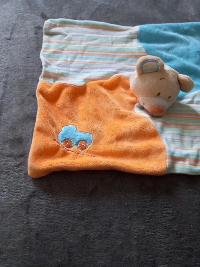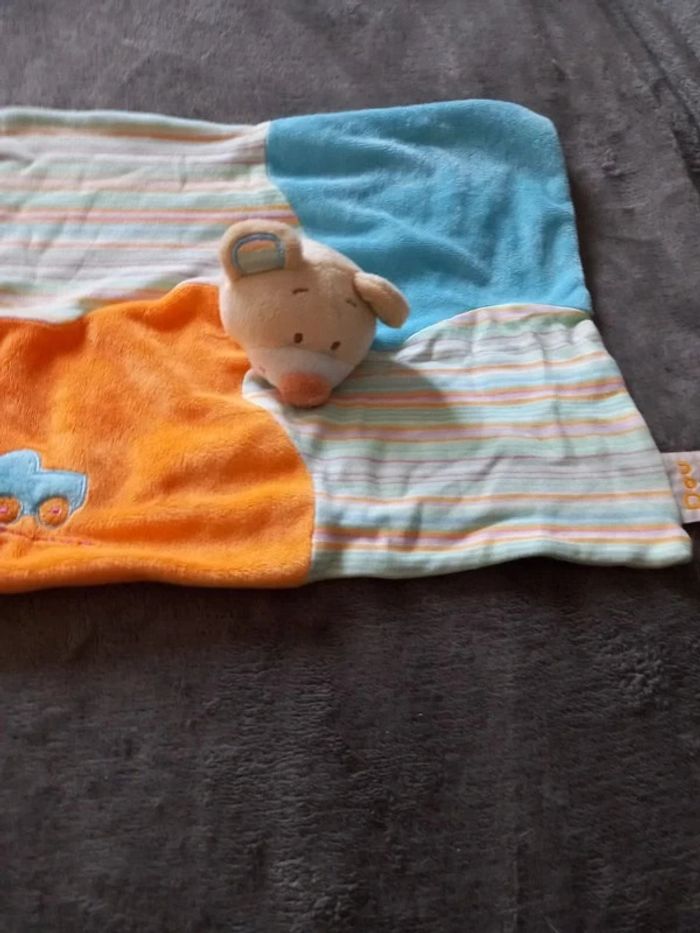 Lot de 2 Doudous plats marionnette doigt Souris Doudou divisé en 4 une case de couleur bleu une de couleur orange avec motif voiture bleu et orange et 2 à rayures multicolores Au milieu tête de souris Diamètre 29 sur 26 cm Marque : Dou Kidou Article en très bon état