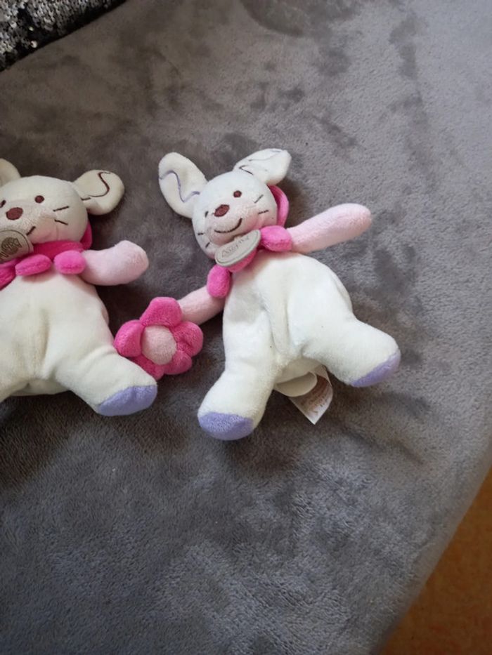 Lot de 2 Doudous chiens divers coloris avec une fleur de couleurs rose foncé à rose clair Hauteur : 19 cm Marque : Baby Nat En parfait état