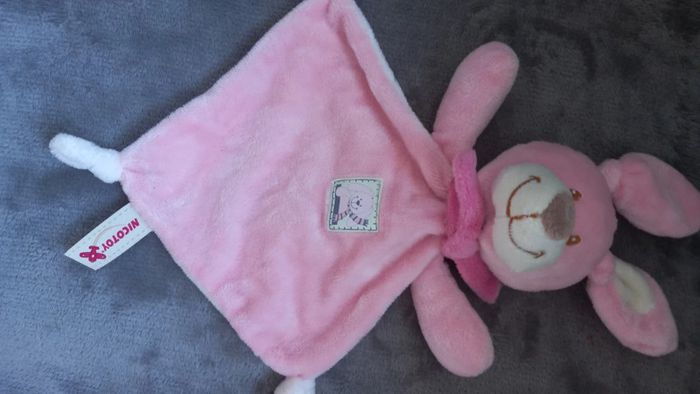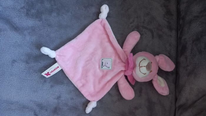 Doudou Lapin de couleurs rose clair et rose foncé avec nœuds dans les coins et étiquette sur le dessus avec motif Lapin Marque : Nicotoy Article en parfait état