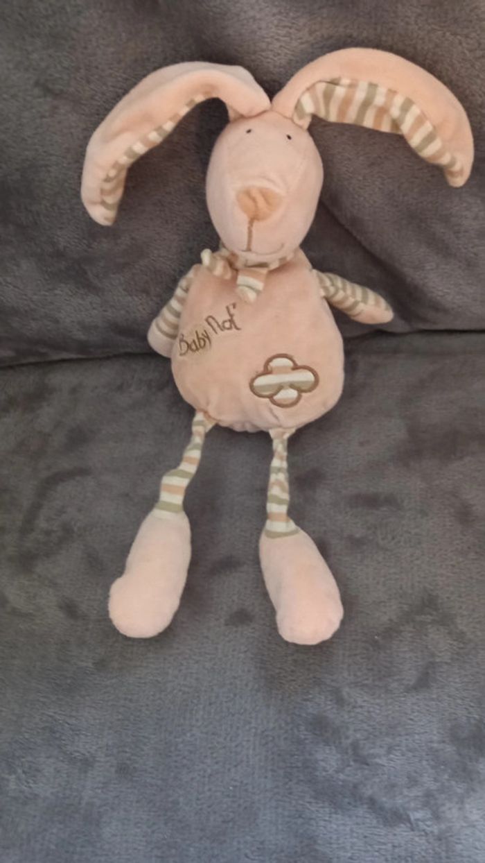 Doudou peluche lapin de couleurs brun clair vert clair avec motifs et écritures Marque : Baby Nat En parfait état