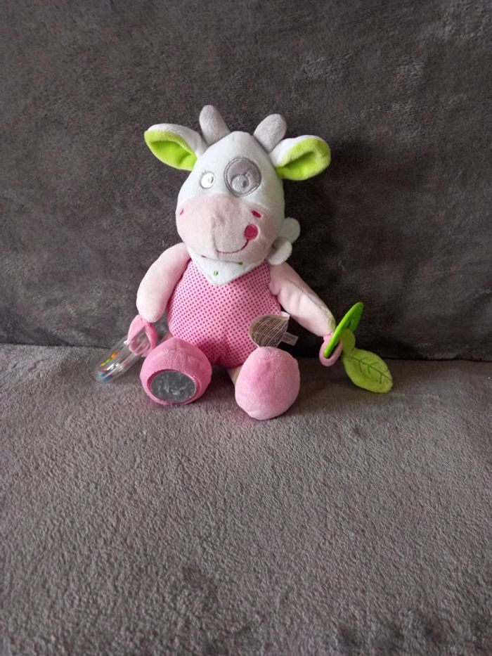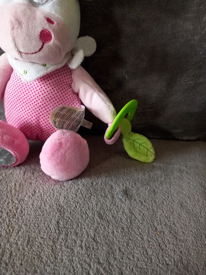 Doudou vache de couleurs rose blanc et vert avec hochet et anneau dentition avec feuille verte .A l un des pieds un petit miroir ,le papier est encore dessus sur le miroir Doudou neuf sans étiquette Marque : Mots d'enfants