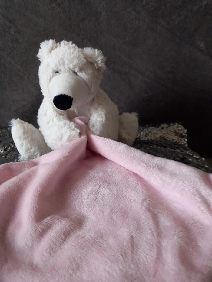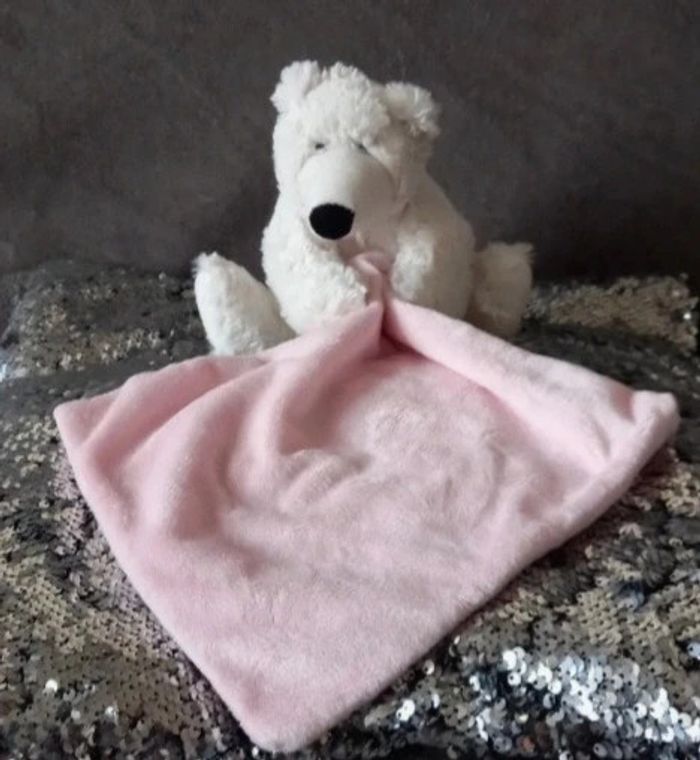Doudou peluche ours en velours de couleur blanc avec mouchoir en velours de couleur rose clair Hauteur de l ourson : 18 cm Marque Eco 6 Éducation &conservation En très bon état