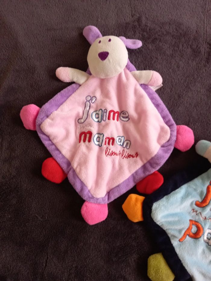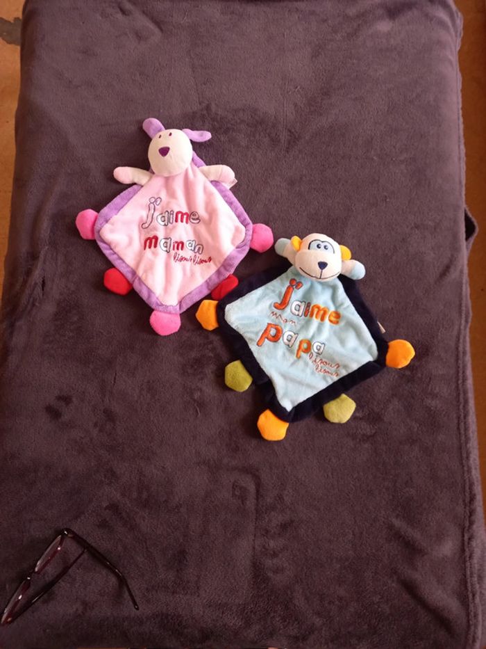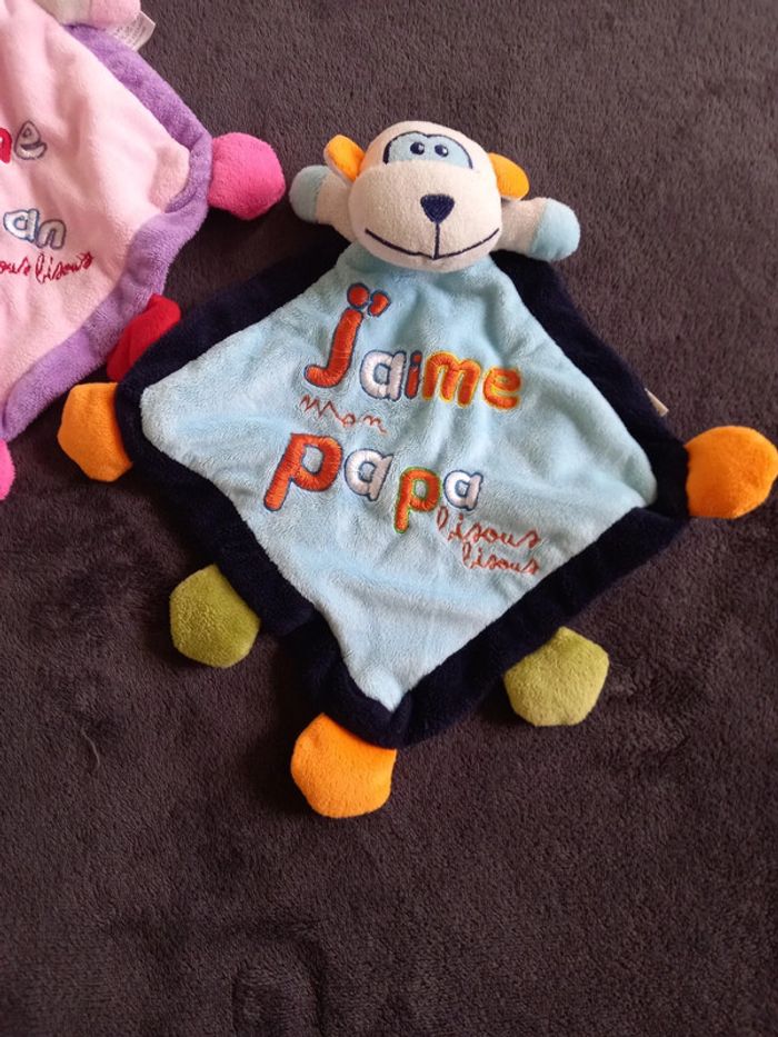 Lot de 2 doudous plats 1 singe avec inscriptions j aime mon papa bisous bisous et 1 chien même phrase sauf inscrit maman. Marque : Central Vet Article état neuf