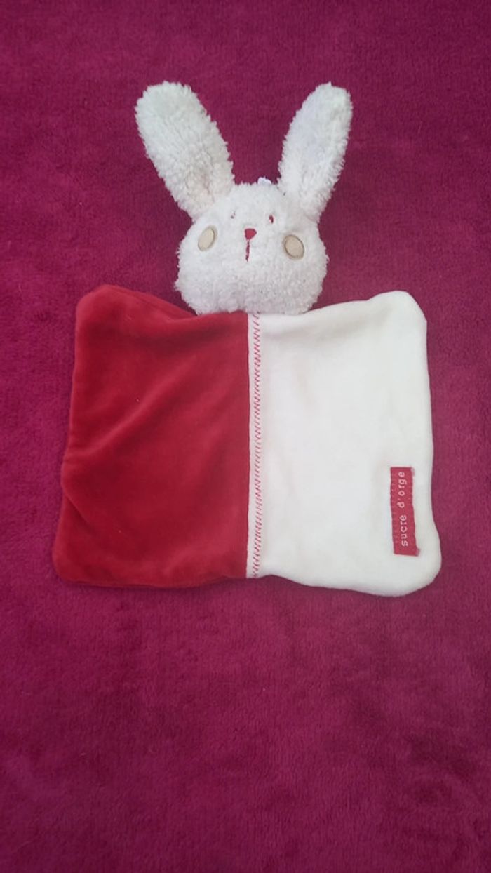 Doudou carré de couleurs rouge et blanc avec tête de lapin blanc Marque : Sucre d'orge Article en parfait état