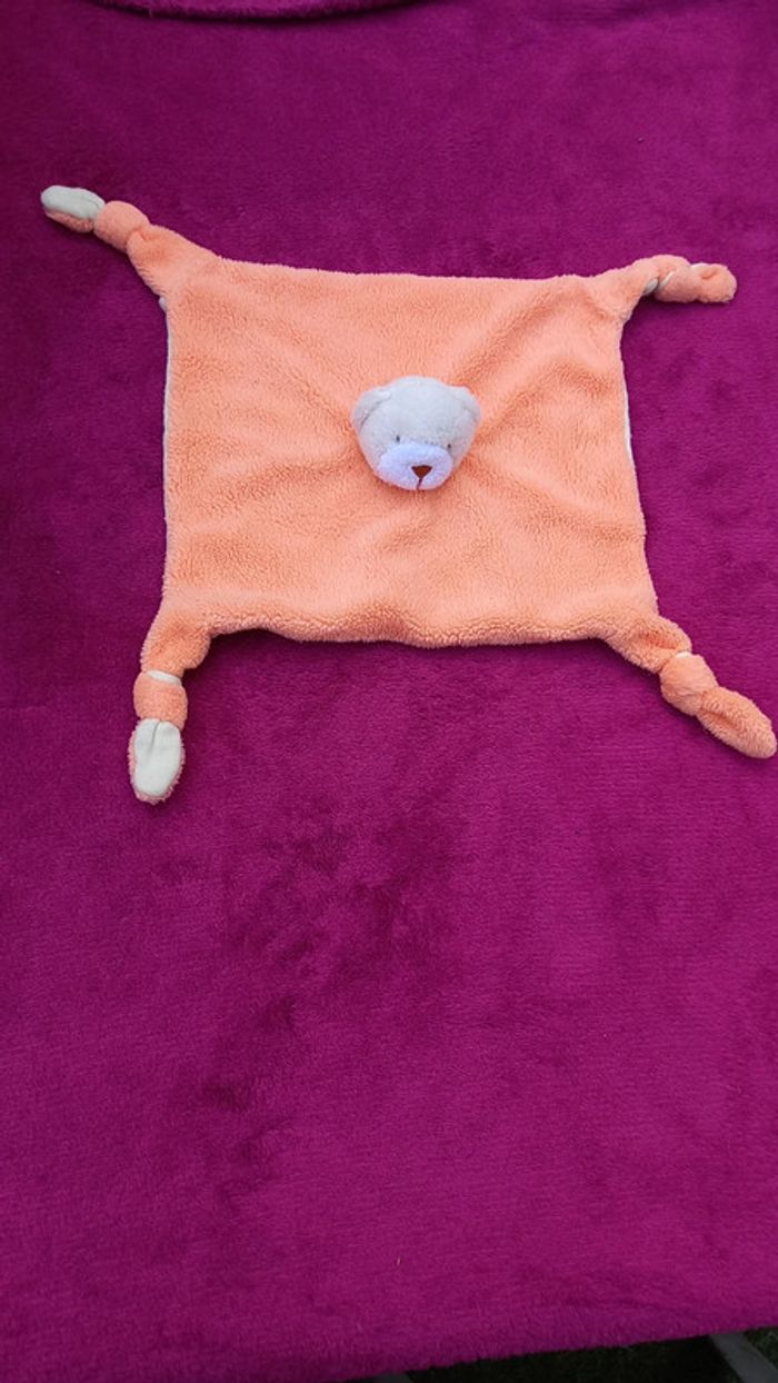 Grand doudou carré orange fluo avec tête d ours et nœuds dans les coins Très bon état