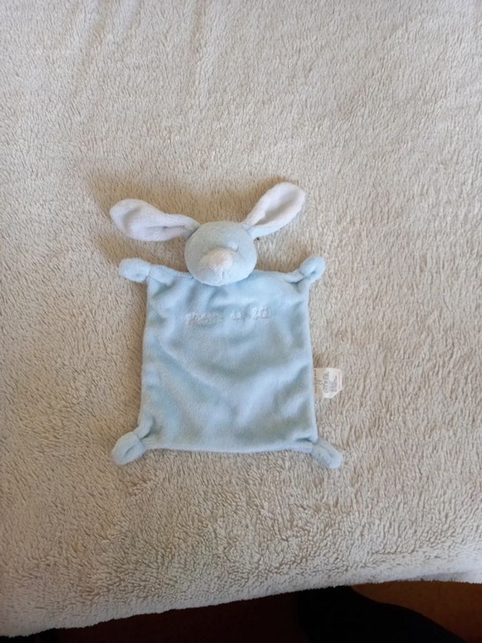 Doudou carré lapin de couleur bleu clair Marque : Grain de blé En parfait état