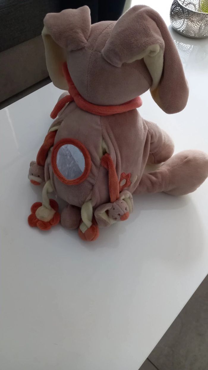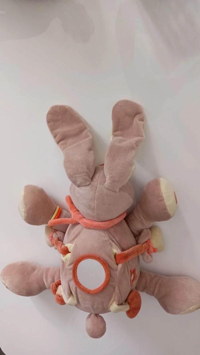 Gros doudou avec divers activités 1 miroir , patte qui fait bruit hochet ,4 petites poches sur le dos pour cacher 1 ours , une fleur à hochet ,1 cœur et un doudou et 2 anneaux Marque : Nattou Article état neuf
