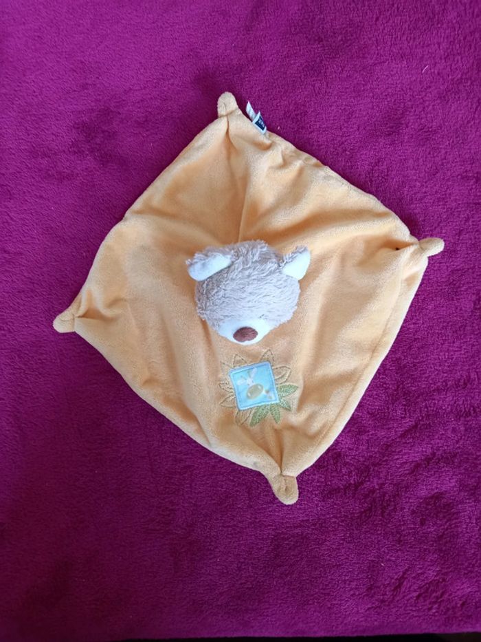 Doudou carré jaune avec tête d ours et motifs Article en parfait état Marque : Tex