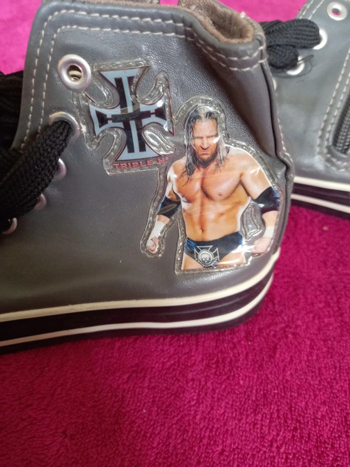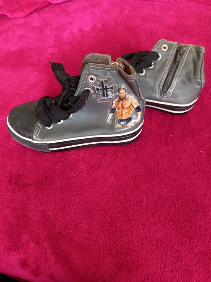 Paire de basket garçon couleur gris foncer avec catcheur Triple H Lacets et zip sur le côté Pointure : 28 Article neuf sans étiquette
