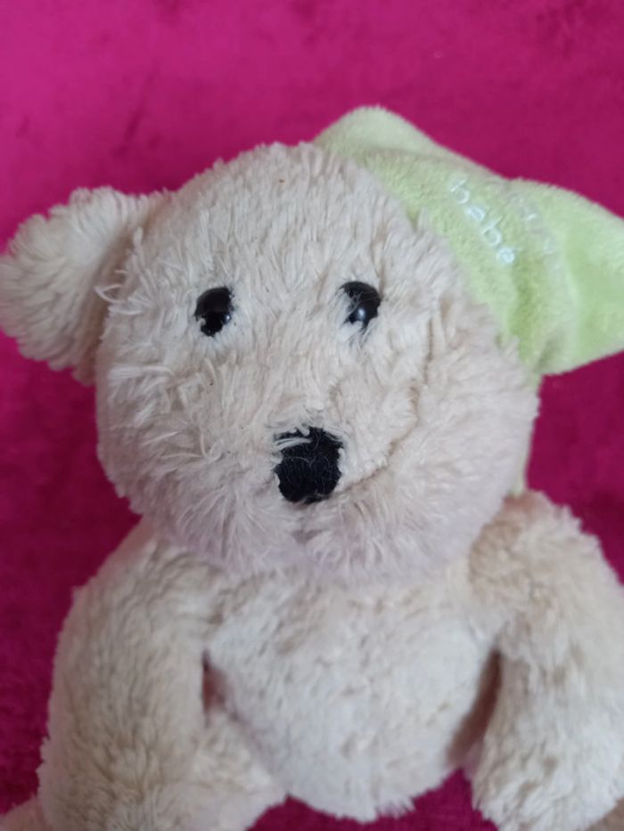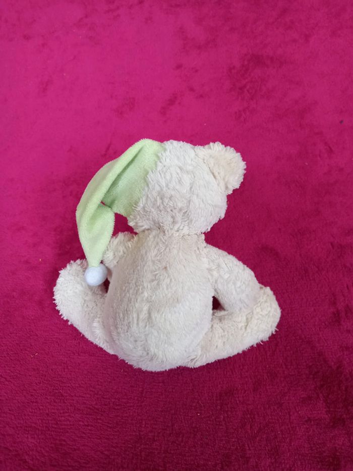Peluche ours blanc avec bonnet de nuit vert avec inscriptions sur le bonnet Alphanova bébé Hauteur : 20 cm Article en très bon état