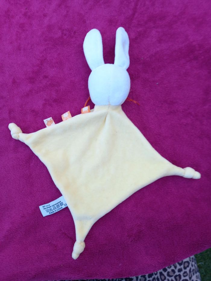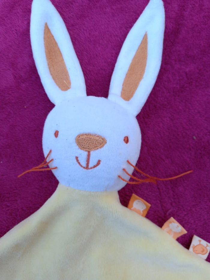 Doudou avec nœuds dans les coins de couleur jaune avec tête de lapin blanc avec orange Marque : Tape à l œil État neuf