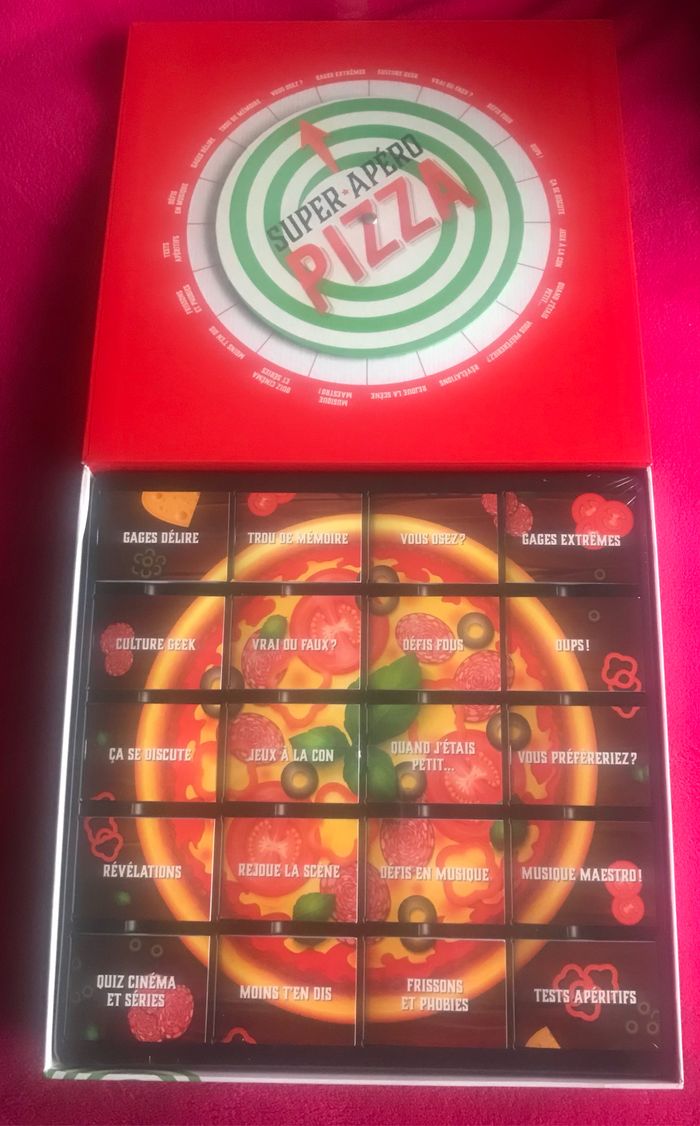 Super Apéro Pizza Installez-vous confortablement avec vos amis autour d'une bonne pizza et commencez la partie ! Faites tourner la roue pour révéler la catégorie : quiz, jeux, gages, révélations, culture générale, mime... Dans ces 20 livrets, vous trouverez plus de 1 000 questions et défis délirants pour des soirées explosives entre amis ! Le boîte de jeu est neuve (jamais utilisée).