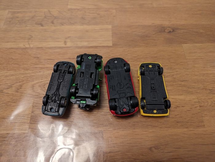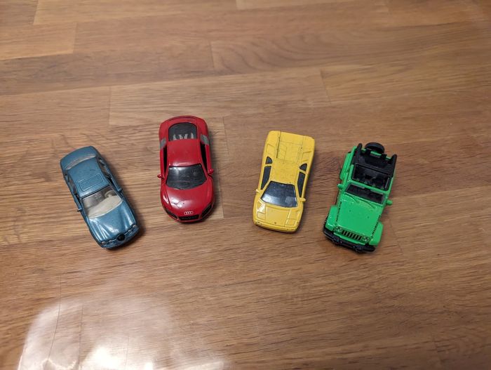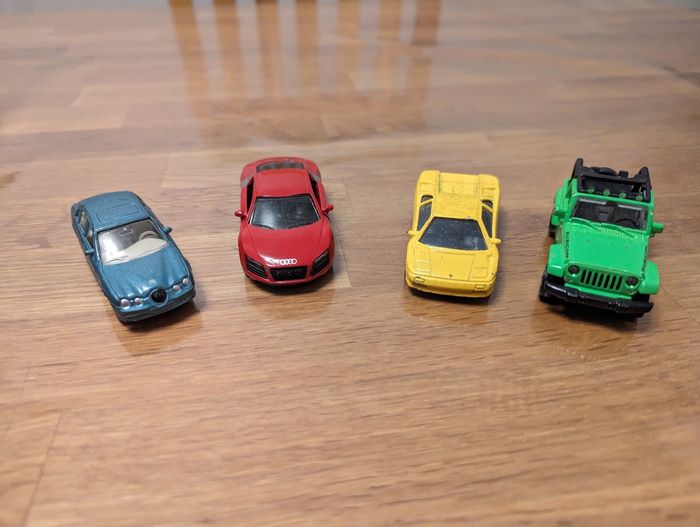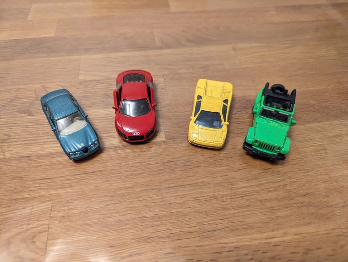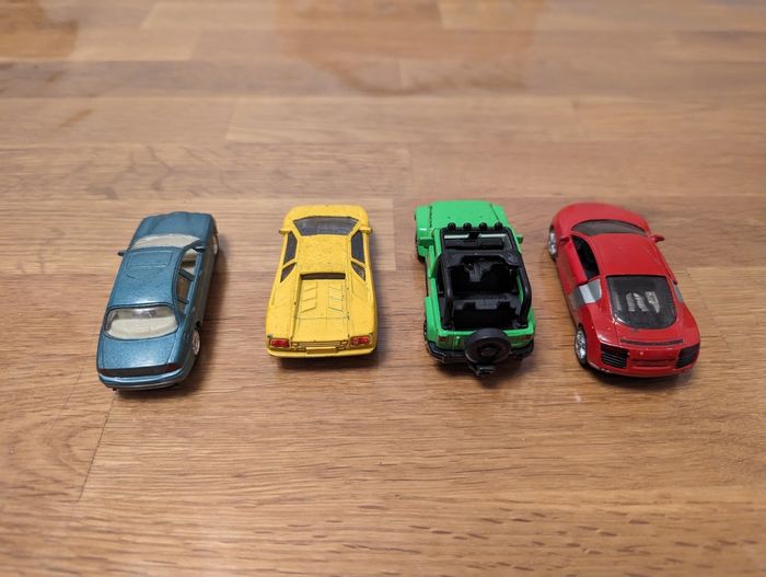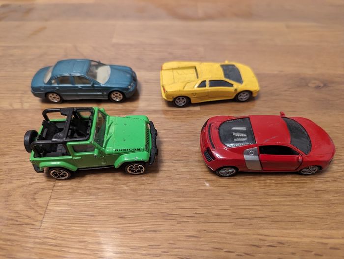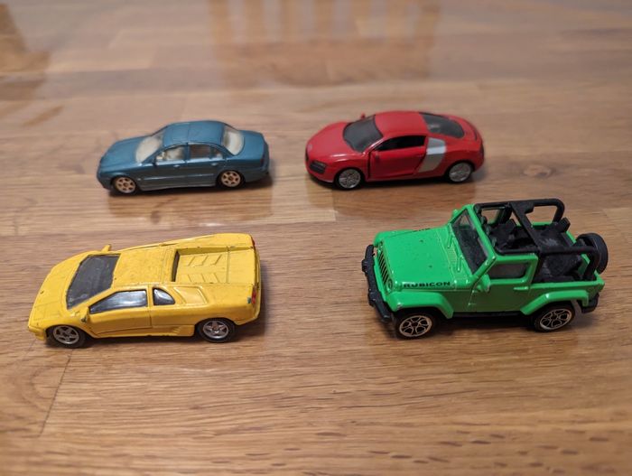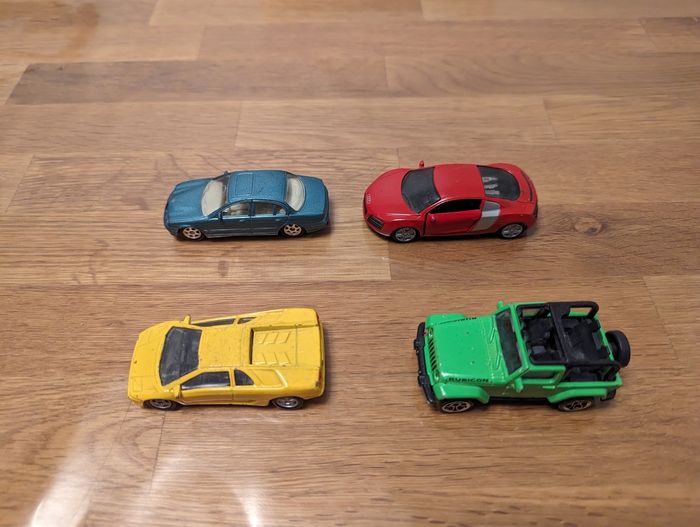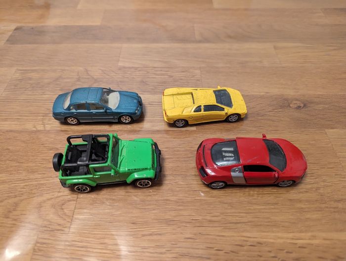 Lot 82 de 4 petites voitures Bon état général mais ont déjà bien vécu. Lamborghini Diablo Audi R8 Jaguar S-Type Jeep Wrangler majorette