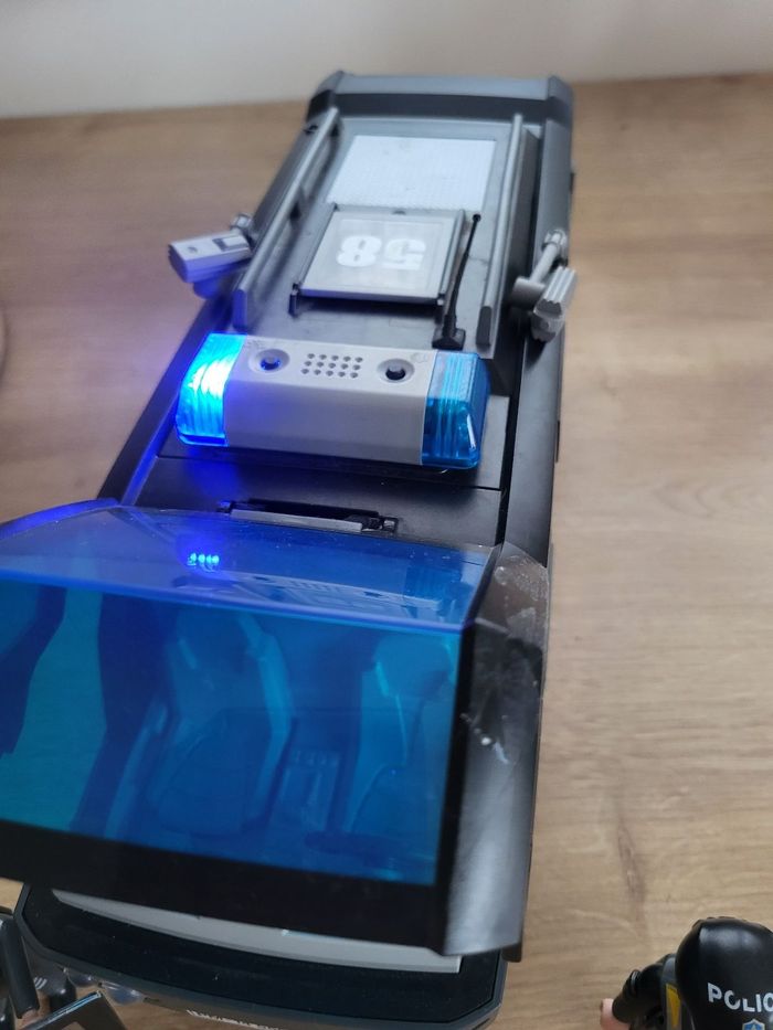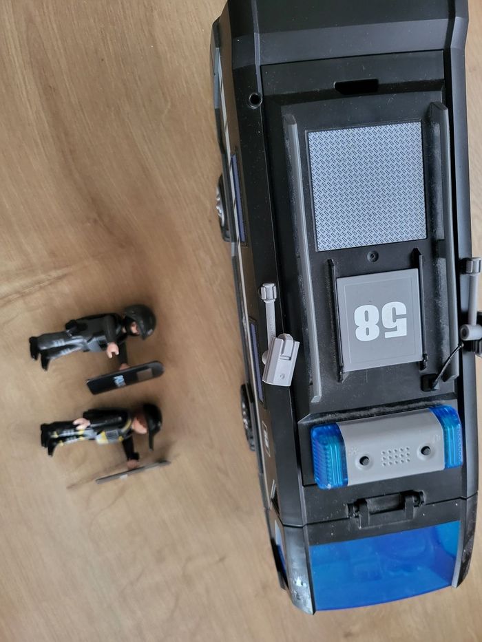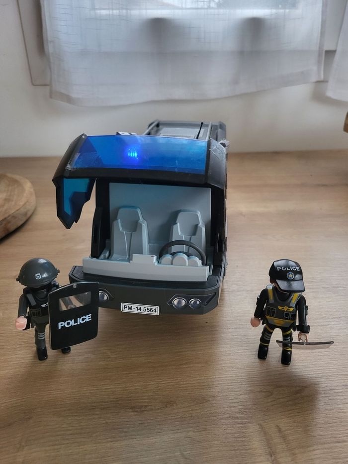 Playmobil Véhicule d'intervention spécial de police Deux policiers Marque Playmobil Sirène et gyrophare fonctionne Le coffre et le pare brise le toit s'ouvre Recommandé à partir de 3 ans