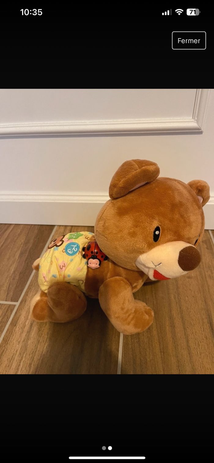 Âge : de 9 mois à 3 ans, un ourson trop mignon qui incite Bébé à se déplacer, à chanter et à découvrir de nouveaux mots Peluche animée : Cet ourson se met à marcher à 4 pattes en chantant pour stimuler la motricité et la curiosité de Bébé pour l’encourager à le suivre Interactif : Quatre boutons interactifs permettent à l’enfant de découvrir les formes et les couleurs et pour écouter des chansons. Une coccinelle lumineuse sur le dos de l’ourson clignote au rythme de la musique