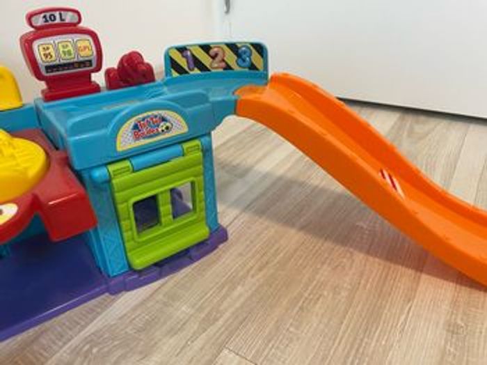 Un atelier pour réparer et customiser le véhicule Tut Tut Bolides ! Un super ascenseur hydraulique avec plateforme pivotante permet d'emmener les véhicules pour la réparation. 1 station d'essence avec 1 rampe à dévaler lorsqu'on a fait le plein. 1 place de parking avec porte-battante pour garer un véhicule. 1 atelier carrosserie avec bombe de peinture pivotante pour jouer à repeindre sa voiture. 2 pièces de jeu incluses qui déclenchent des sons rigolos : une clé pour l'atelier de réparation et un pneu à installer et faire tourner. Le véhicule électronique inclus « Marvin super tuning » déclenche des phrases et des sons amusants lorsqu'il passe au-dessus des 5 zones magiques. 3 chansons et 6 mélodies entraînantes. Dimensions L: 35.6 cm x I: 64.3 cm x H: 26.6 cm Âge 1-5 ans Compatible avec tous les autres univers TUT TUT BOLIDES