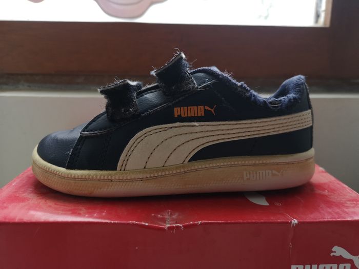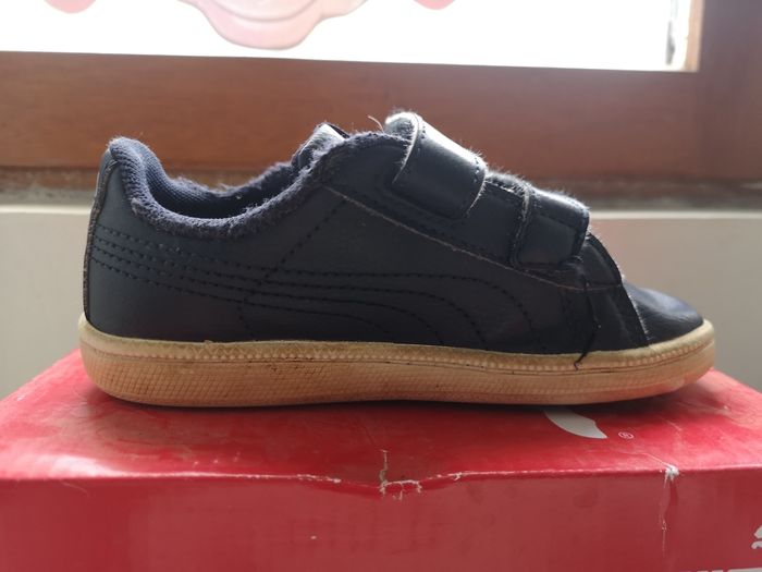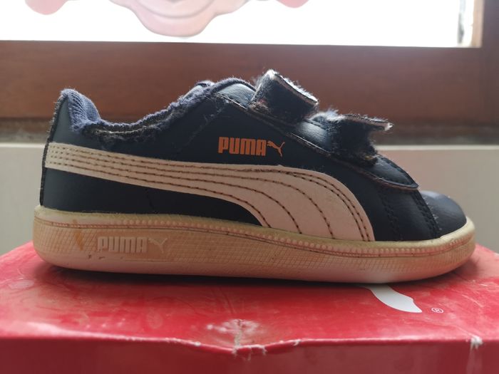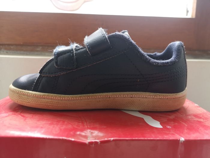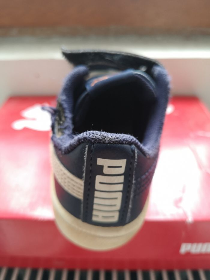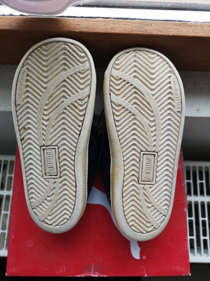 Baskets Puma garçon taille 25 Semelles intérieur et extérieur en parfait état, accros visibles. Mon fils étant handicapé il ne marchait pas avec, se déplaçait juste au sol d'où les accros. Achetées 34,95€.