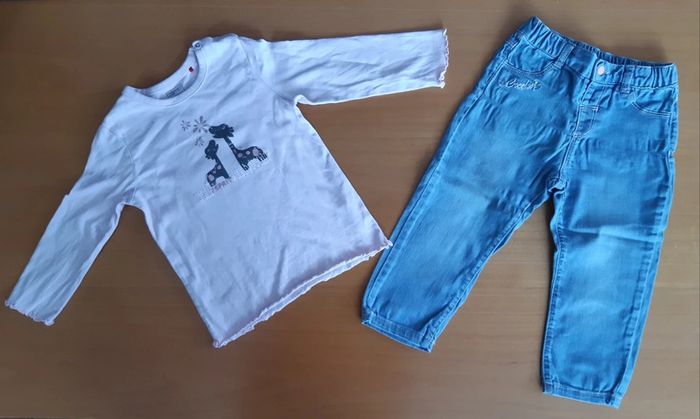 Pantalon en jeans creeks 24 mois avec taille élastique et pressions T-shirt manches longues esprit 24 mois pressions au col motif giraphe avec une petite tâche au coude #amlou80_filledeuxans