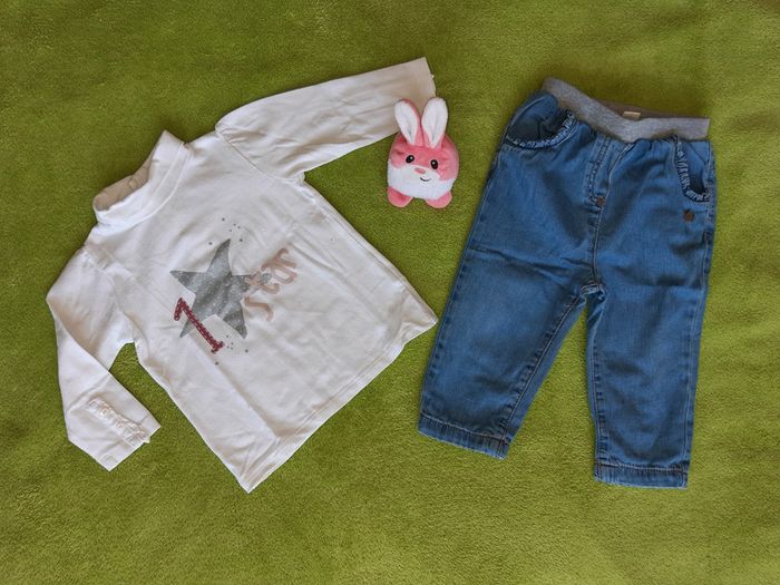 Pantalon en jeans doublé taille élastique Sous pull avec pressions dans le dos Flocage pailleté en très bon état #amlou80_filleneufmois