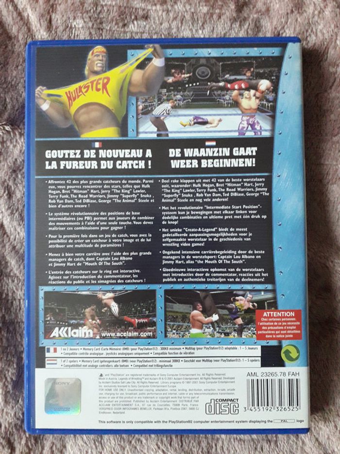 Jeu PS2 legend of wrestling Hulk Hogan est la star de ce jeu de catch ultime qui réunit toutes les icônes de la grande époque : Randy "Macho Man" Savage, Sting, Ultimate Warrior, Andre the Giant, "Rowdy" Roddy Piper, Jake "The Snake" Roberts, Bret "Hitman" Hart, "The American Dream" Dusty Rhodes, Diamond Dallas Page et bien d'autres encore ! Aklaim age 12 et + très bon état