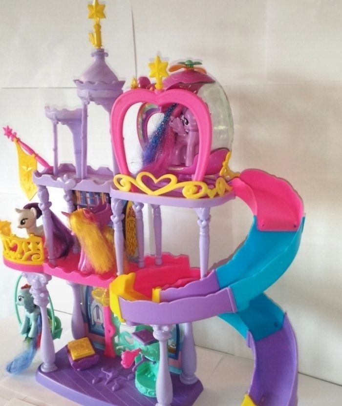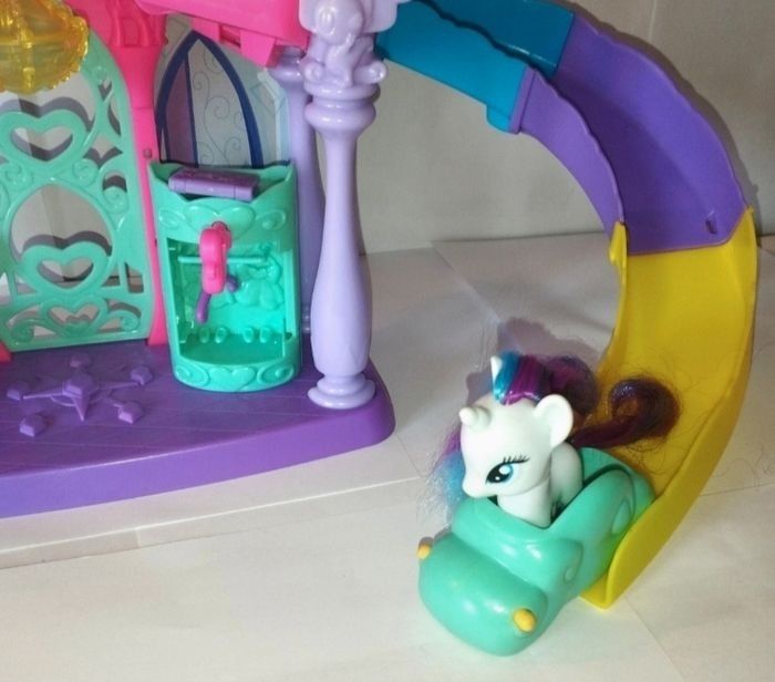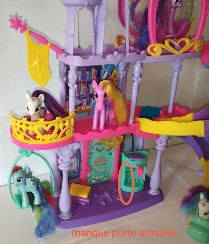 Château Twilight My Little pony. 5 Pony 1 hélicoptère, une voiturette pour le toboggan et différents accessoires. ⚠️ Manque quelques pièces voir photos ci-jointes.