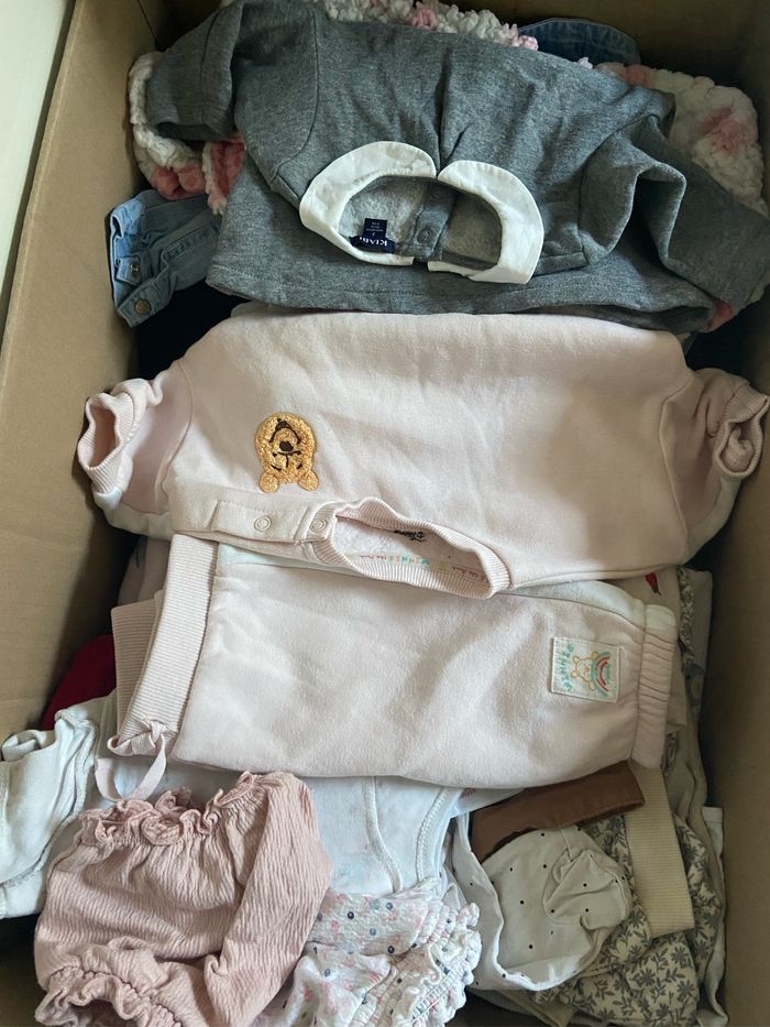 Très gros carton contenant des vêtements de 0 à 6mois, des pyjamas, bodies,ensemble , hauts et bas, robes etc tout est en très bonne état.
