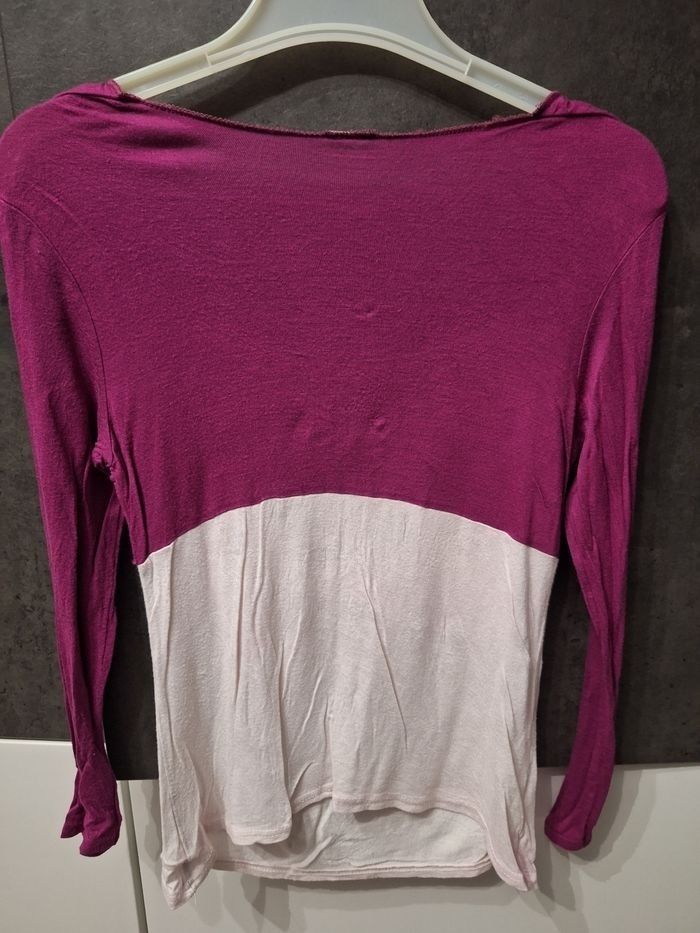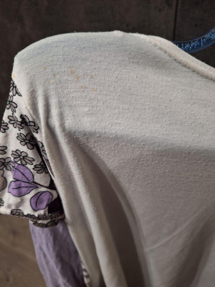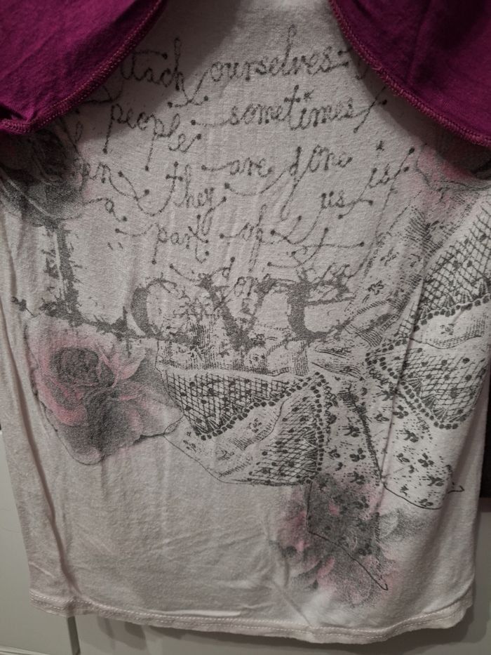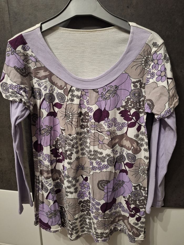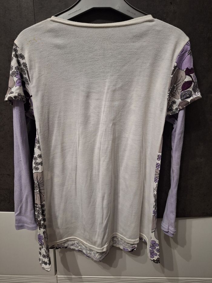 Lot de 2 t-shirts manches longues, 1 effet cache coeur violine et blanc inscriptions devant, 1 effet superposition de t-shirts motifs fleurs parme et grise col et manches parme dos blanc (petites tâches sur 1 épaule), plus d'étiquettes, taille 12 ans, portés mais en bon état