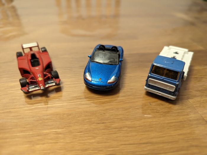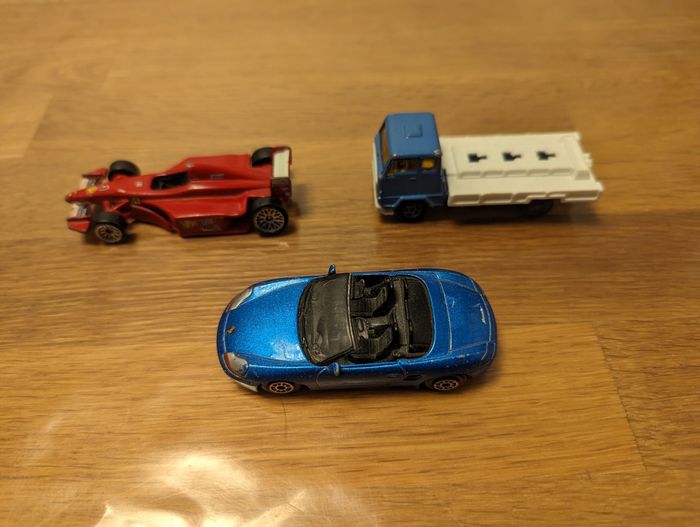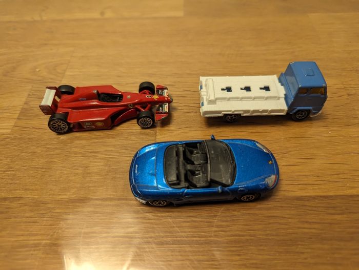 Lot 87 de 3 petites voitures État correct, des défauts sont présents. Porsche Boxster bleu Hotwheels rouge