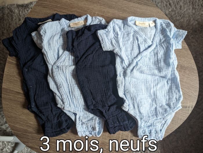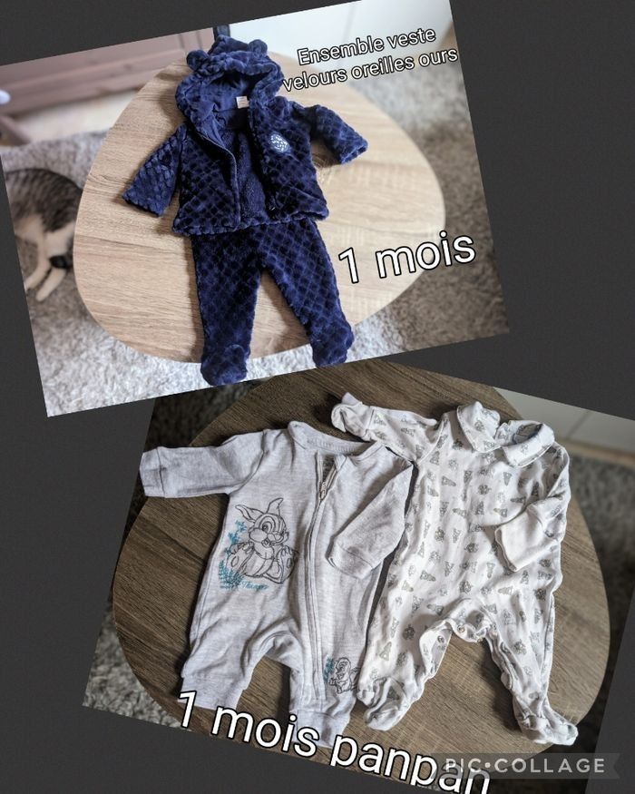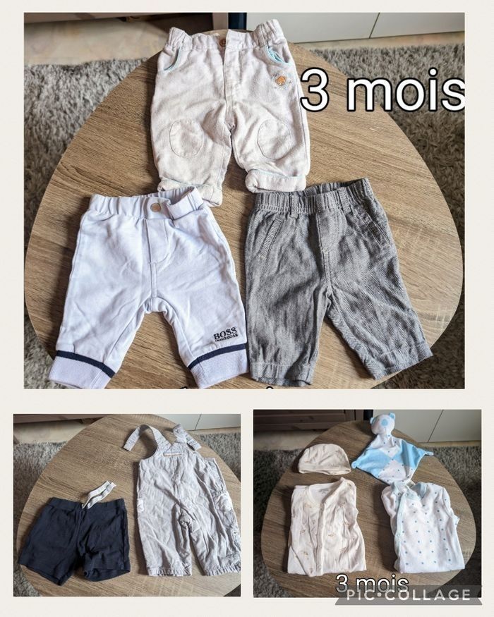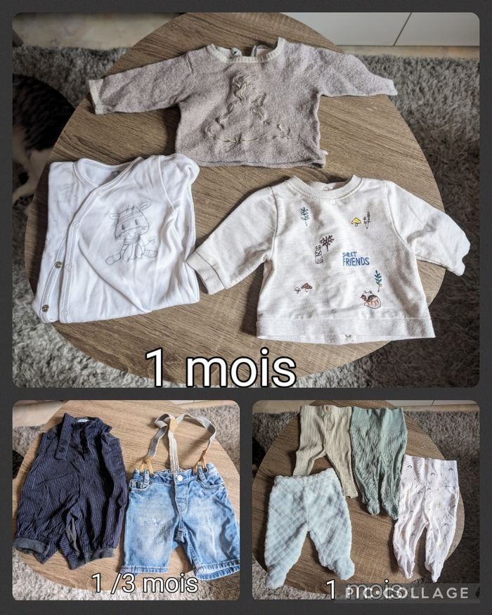 Ayant accouché en septembre, j'ai du acheté a la fois du été , automne et hivers. C'est pourquoi vous retrouverez un mix de coton, velours, manche longue et manche courte. Mon bébé ayant pesée presque 4 kg, il était plus à l'aise dans du 3 mois. Il y a donc un mix naissance et 3 mois. En tout 33 pièces dans le lot.