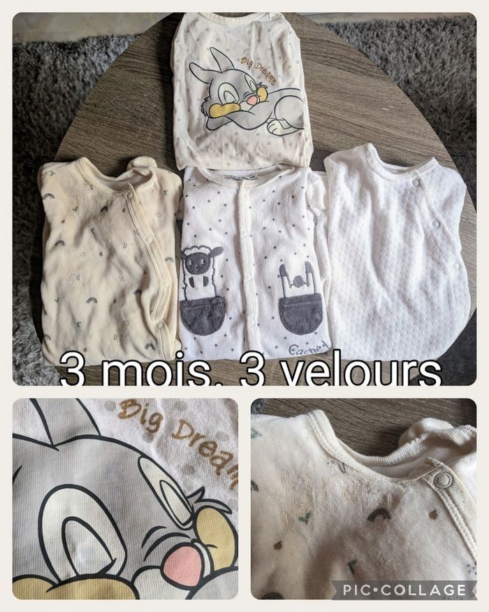 3 pyjama velours 3 mois dont 1 avec des traces un peu durci ( lait ) ( voir photo)