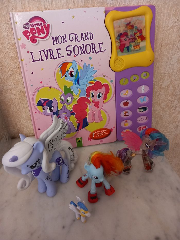 Livre sonore en excelent état, possibilité d' enregistrer sa voix + des figurines mittle pony avec N° de serie