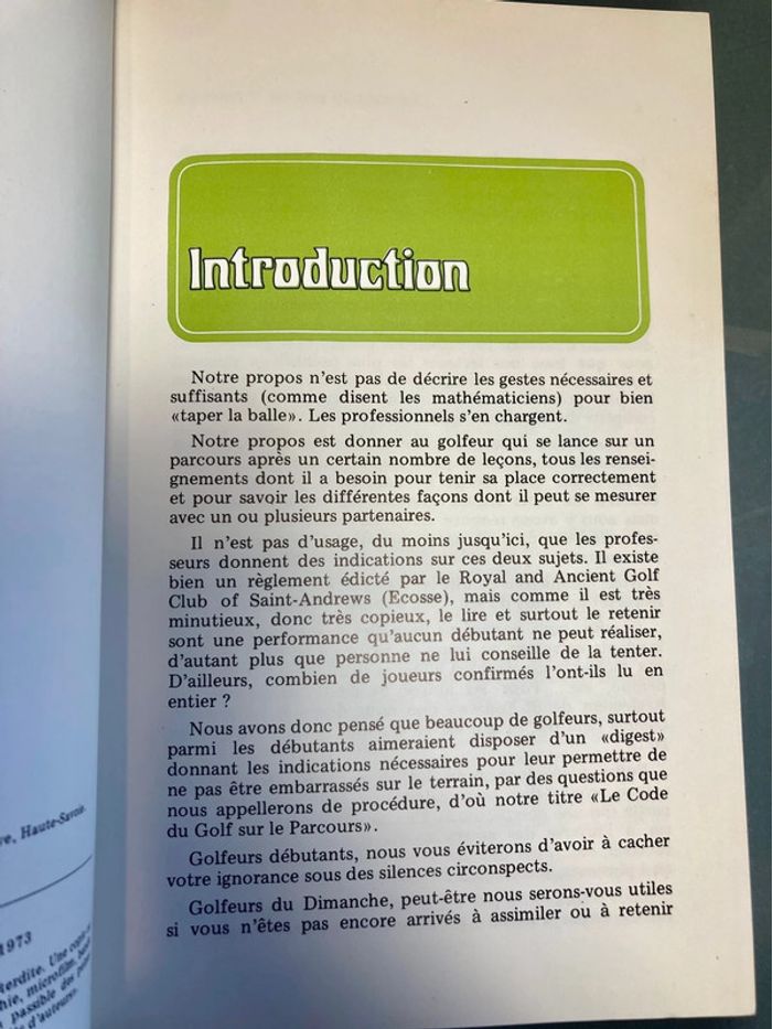 1973 : Le code du golf Livre ancien : Le code du golf sur le parcours Livre vintage rare, traitant de la bonne conduite du gentleman sur le green. Titre complet : " Le Code Du Golf Sur Le Parcours & Les Regles De Saint-Andrews. " Roger Golias - André Simonnet Editions Chiron 1973. Il ne s'agit pas d'un guide technique, mais d'une sorte de guide de savoir vivre, qui condense le protocole à appliquer. Cadeau personnel et original. Emballage soigné, expédition rapide ✔ @LootboxAvenue 👉N'hésitez pas à nous contacter si vous désirez constituer un lot dans notre dressing ( L'option n'est pas automatique pour les vendeurs pros ) ; nous sommes disponibles, réactifs, et une remise sera appliquée avec plaisir dès deux articles commandés. 👍 Retrouvez nos autres livres et BD en tous genres 👇 #LivreBDLootboxAvenue ISBN 2702703070 #collector #collection #rare #vintage #ancien #livrerare #sport #livredesport #guidesport #livreancien #standrews #seventies #années70 #club #caddie #putter #egf #apprentissage #broché #lootboxavenue #oldieslootboxavenue #France #fédérationFrançaisedegolf #ffg #xmas #christmas #noel #souslesapin