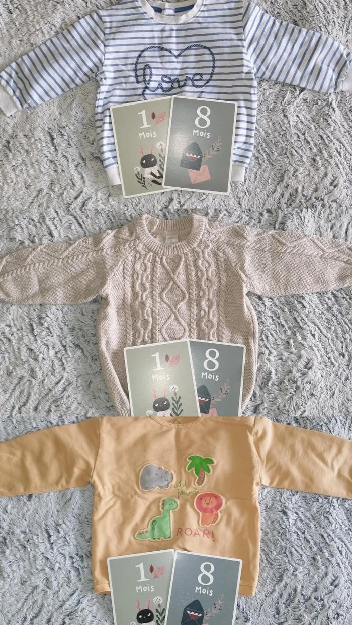 Je vends ce lot de 3 pulls Tex et H&M Taille 18 mois En très bon état, juste le pull jaune a 2 petites tâches