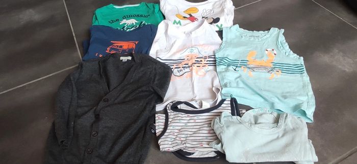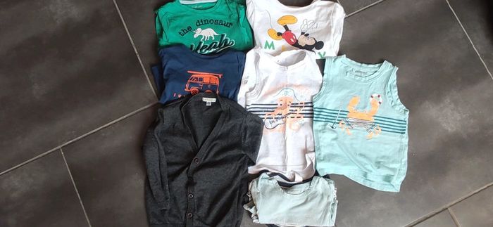 Lot de tee-shirt garçon de taille 3 ans, de différentes marques dont Vert Baudet et orchestra. Il y a 2 débardeurs, 3 tee-shirts manches courtes, 2 bodies manches courtes et un gilet. Les lettres du tee-shirt Mickey sont abimées.