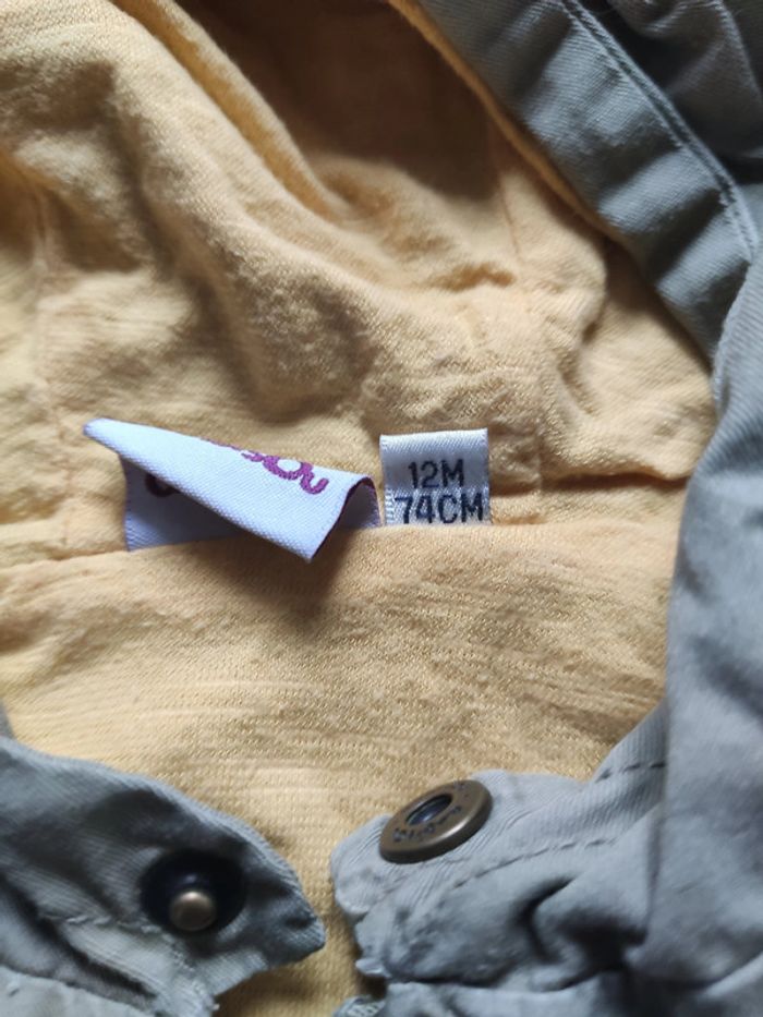 Manteau mi-saison avec capuche, de taille 1 an, de couleur kaki, idéal pour le printemps. En très bon état.