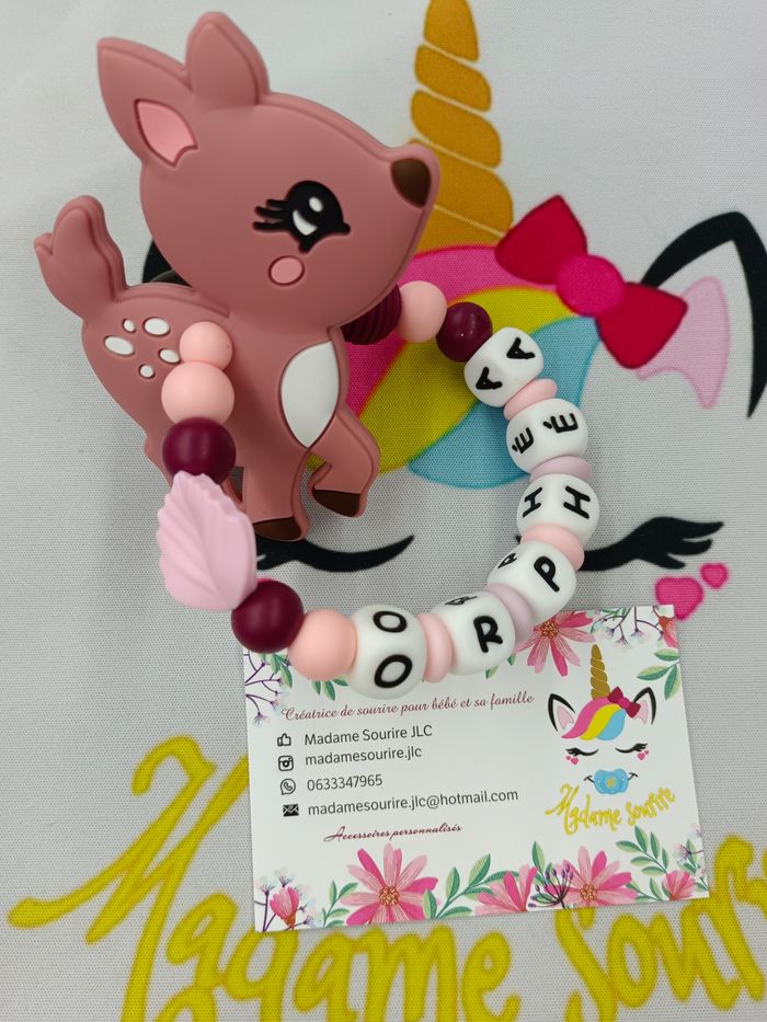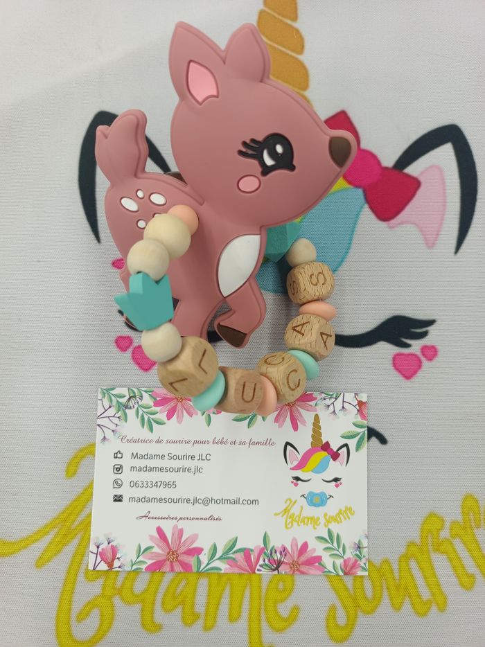 Hochet Faon 100% personnalisable en silicone alimentaire et/ou bois naturel. Large choix de perles, le style, les couleurs, nous personnalisons ensemble main dans la main pour créer votre accessoire idéal. Contactez-moi par message pour personnaliser ou tout renseignement.