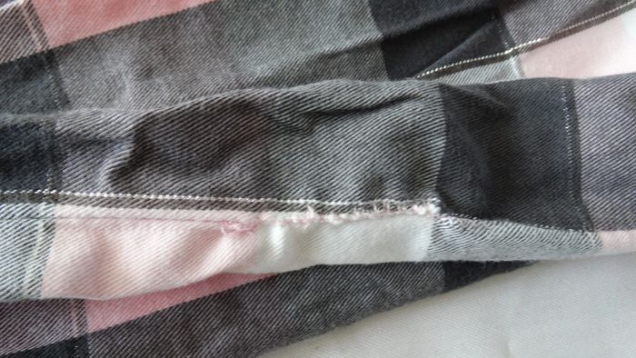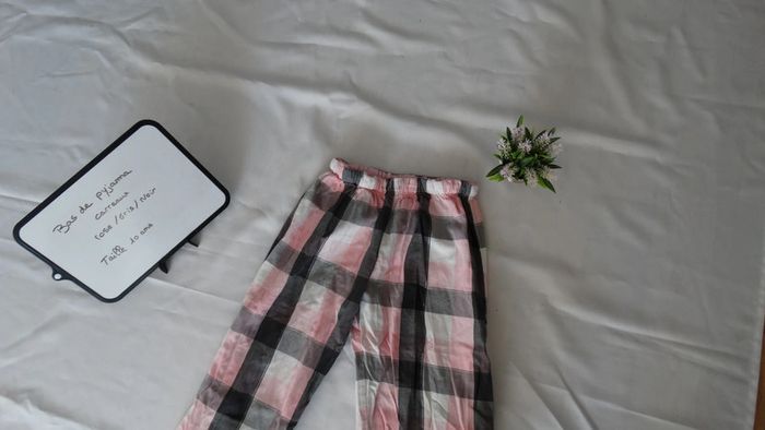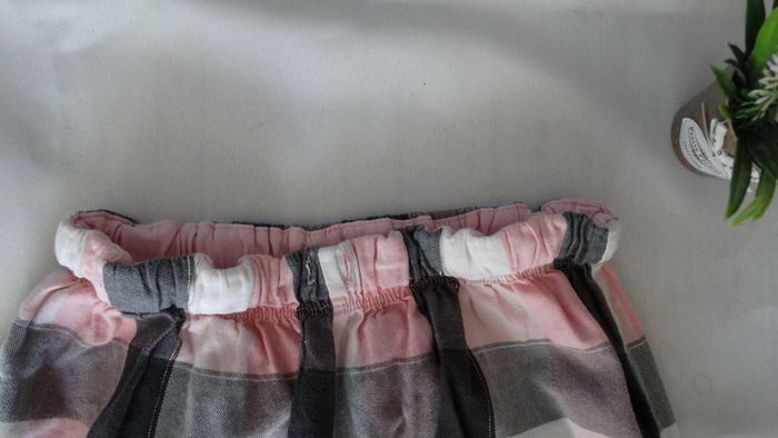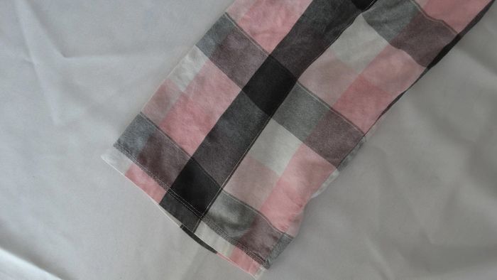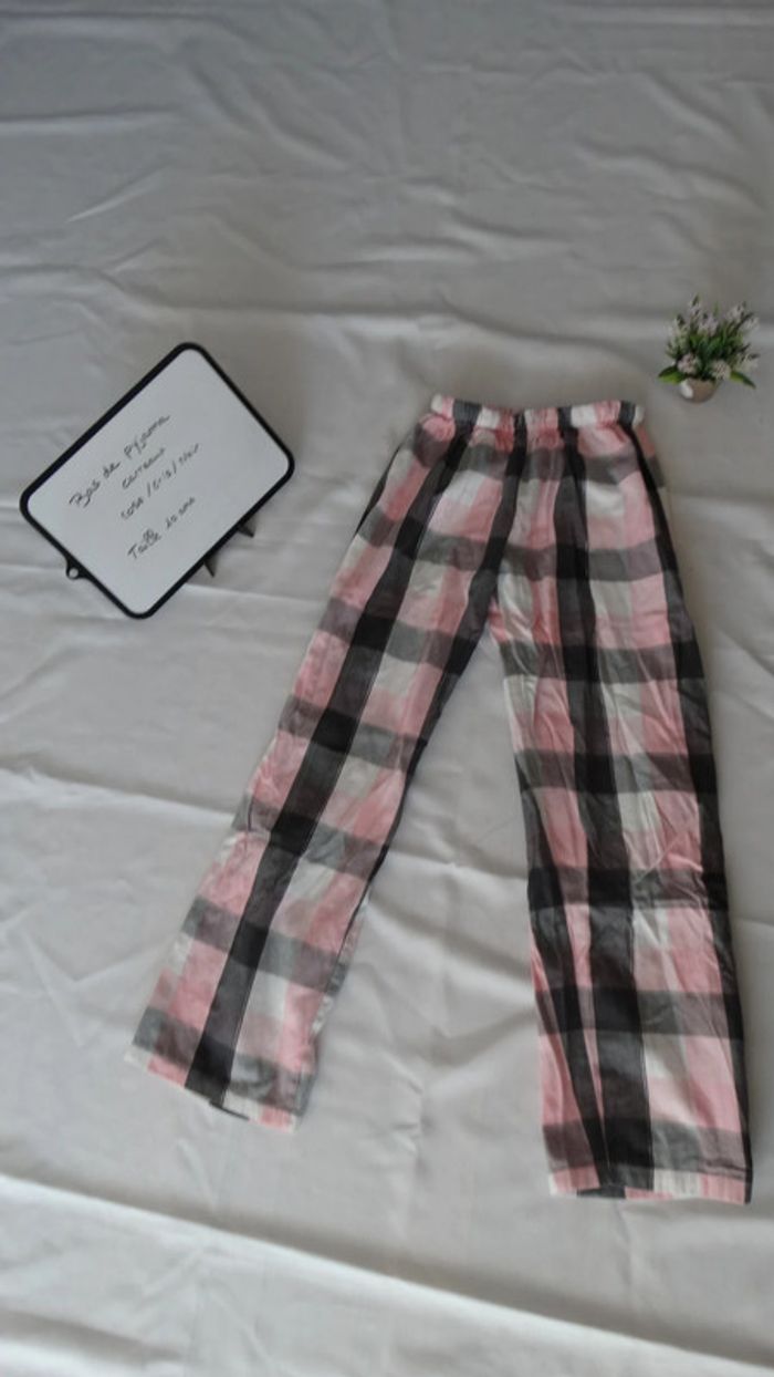 Bas de pyjama carreaux rose/gris/noir recousu sur une jambe sur un coté " voir dernière photo"