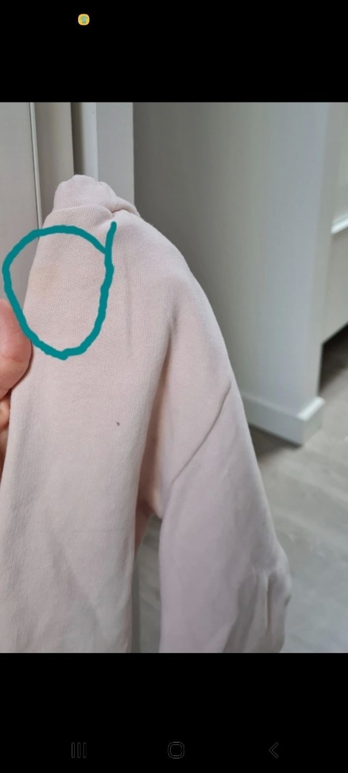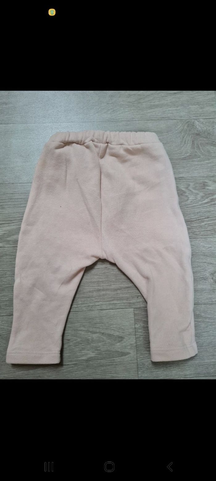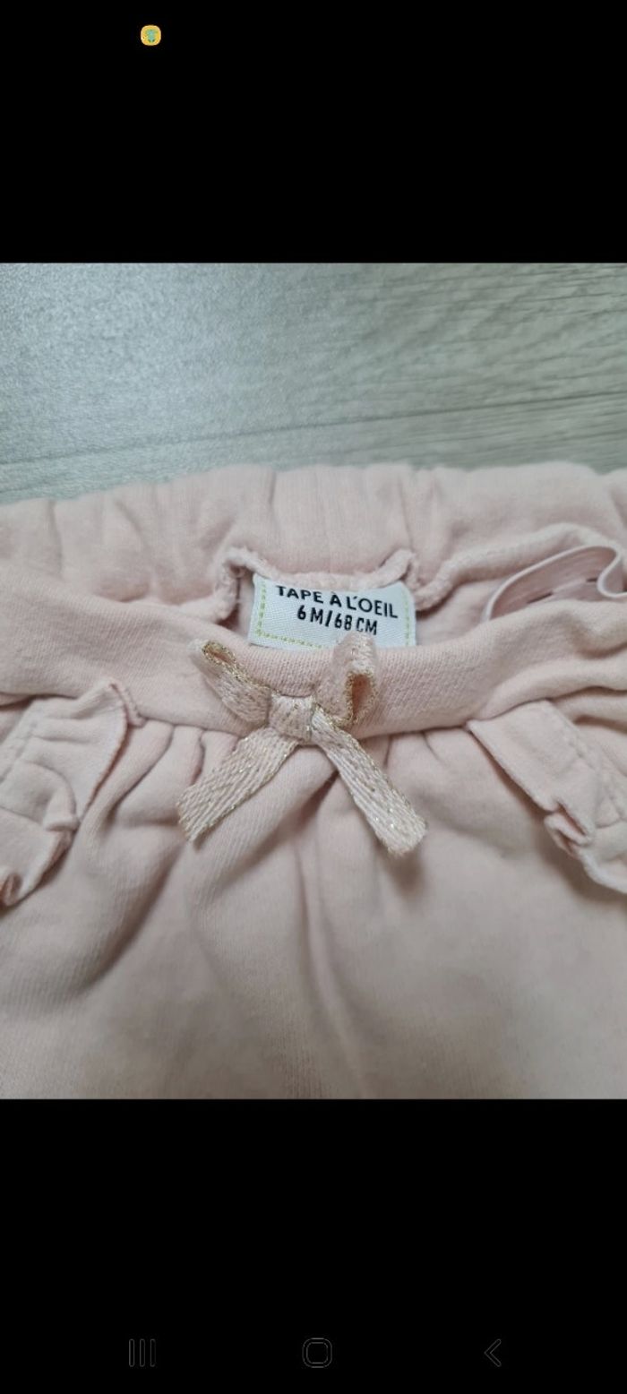 Pantalon rose pâle avec petit nœud pailleté à la taille marque Tape à l'Oeil. Élastiques d'ajustement à la taille. Très bon état hormis une légère tâche en haut de la fesse gauche (cf photo, on a du mal à la voir). 6 mois. Tous mes articles sont lavés avant la vente.