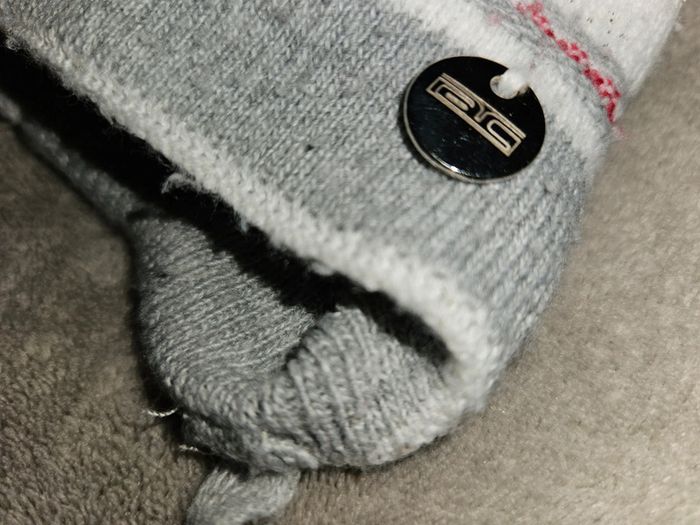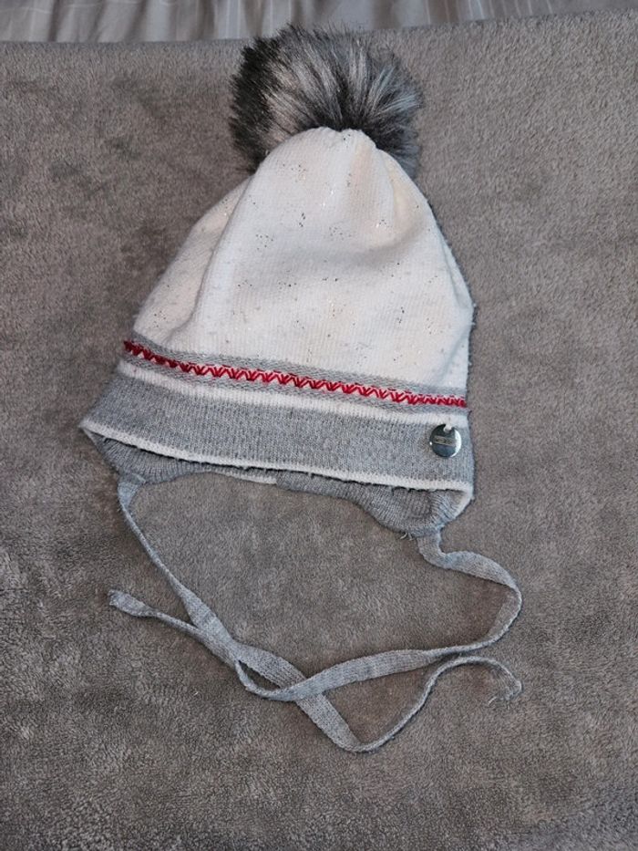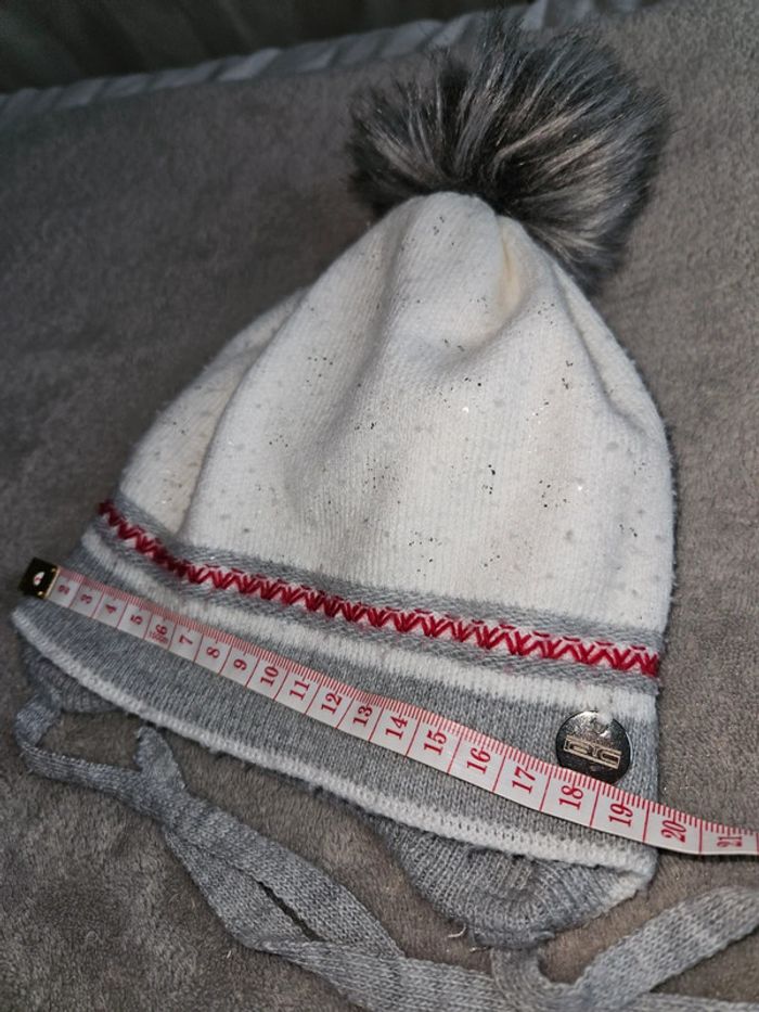 Très joli bonnet de bébé avec pompon Porté 2 à 3 fois, comme neuf Très sympa Extensible peu se porter plus longtemps #bonnet #pompon #blancapaillettes #liseré #ac #acgroup