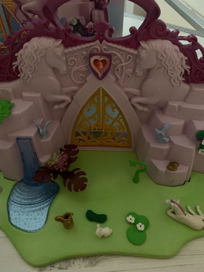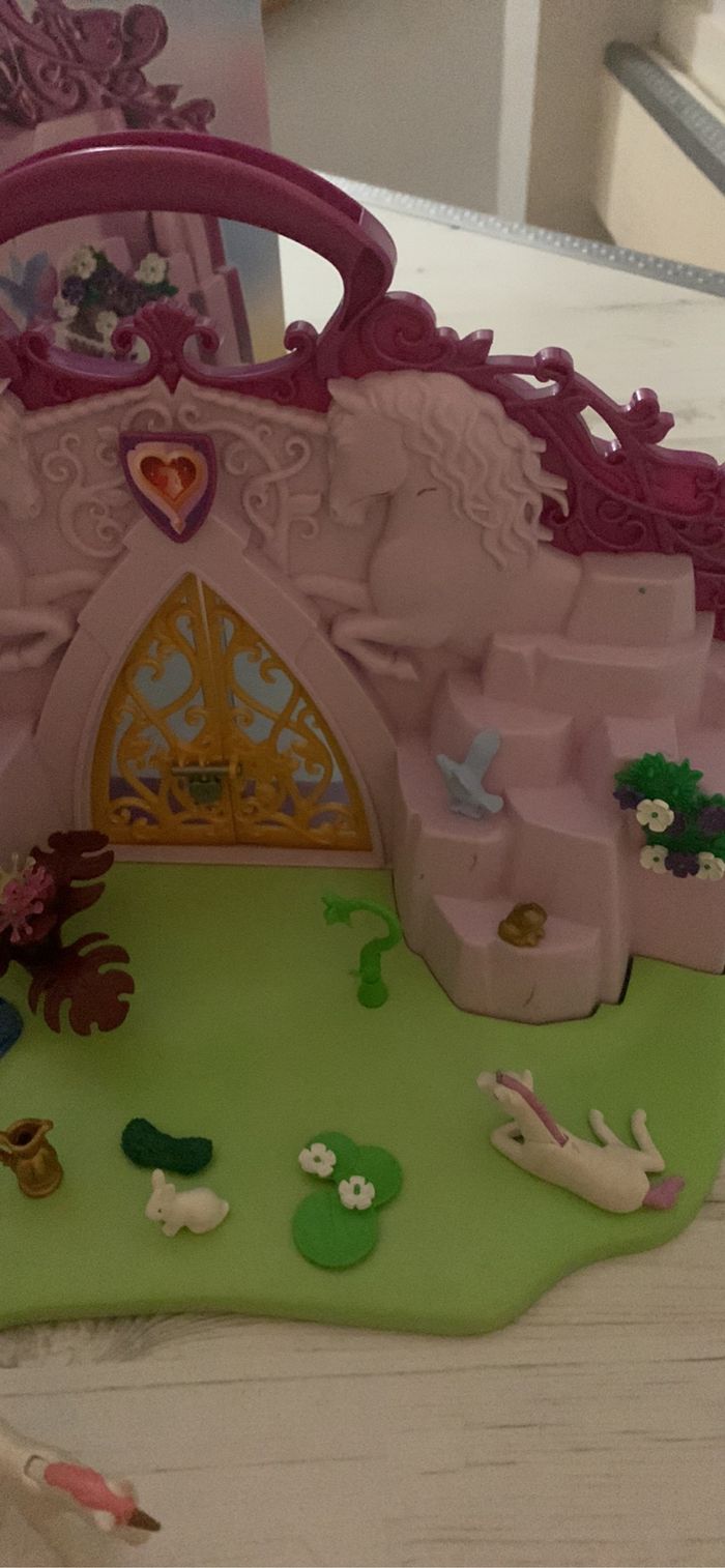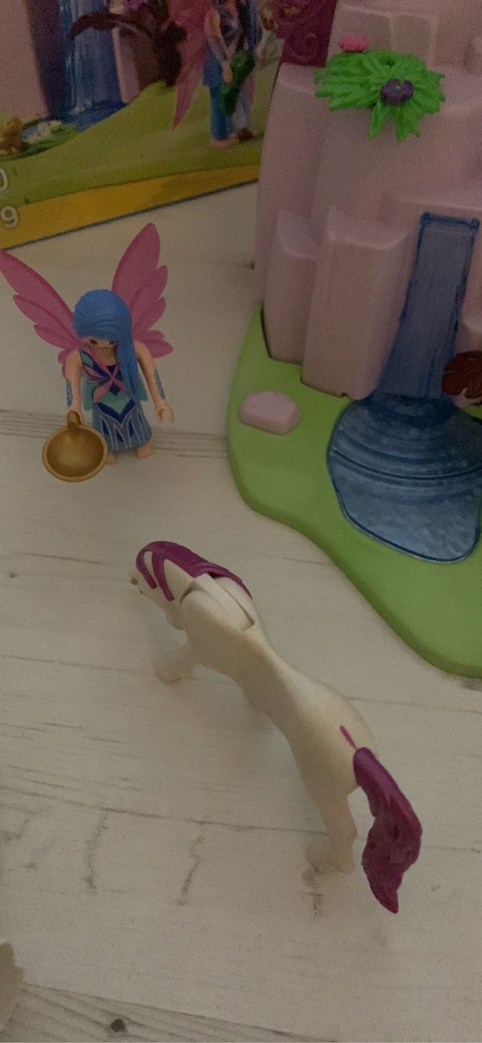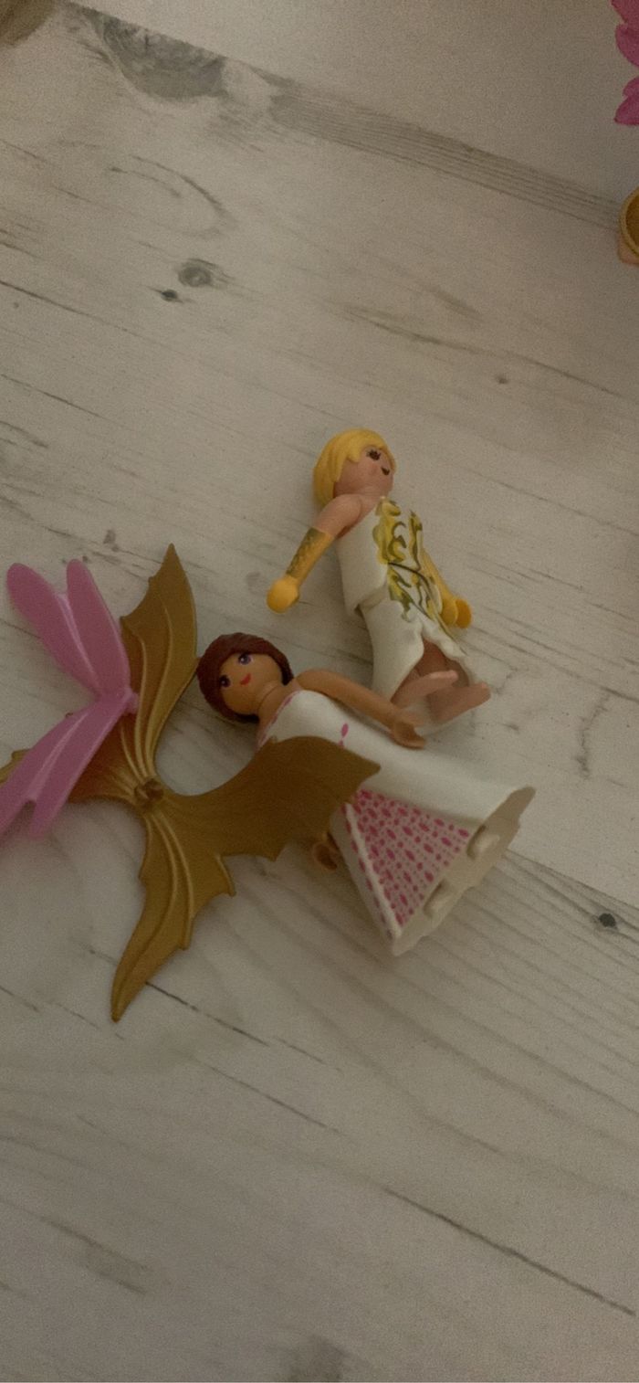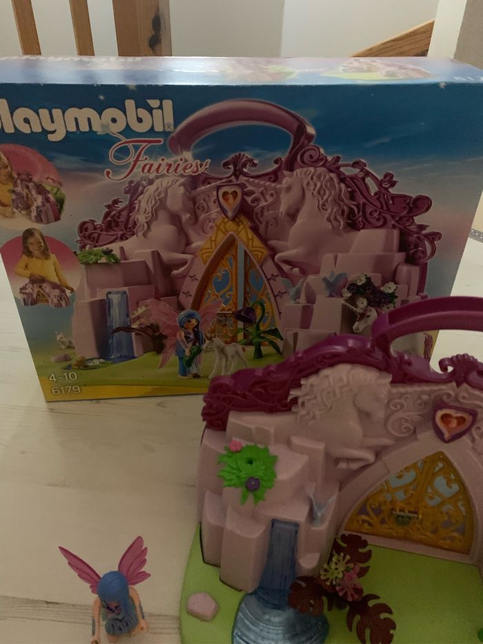 Playmobil Fairies 6179. Les fleurs sont un peu abîmées mais n’empêche pas le jeu. 2 personnages ont été rajoutés au lot avec 2 paires d’ailes. Vendu avec la boîte idéal pour offrir.