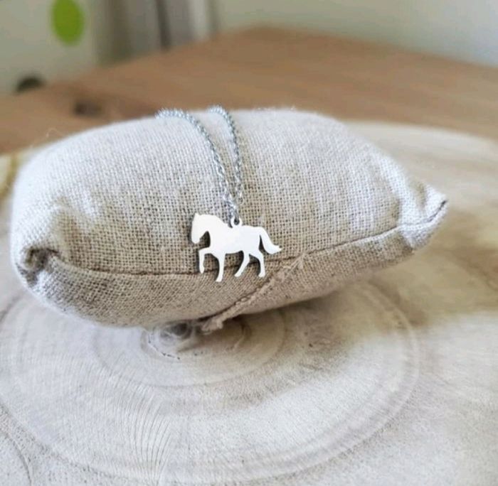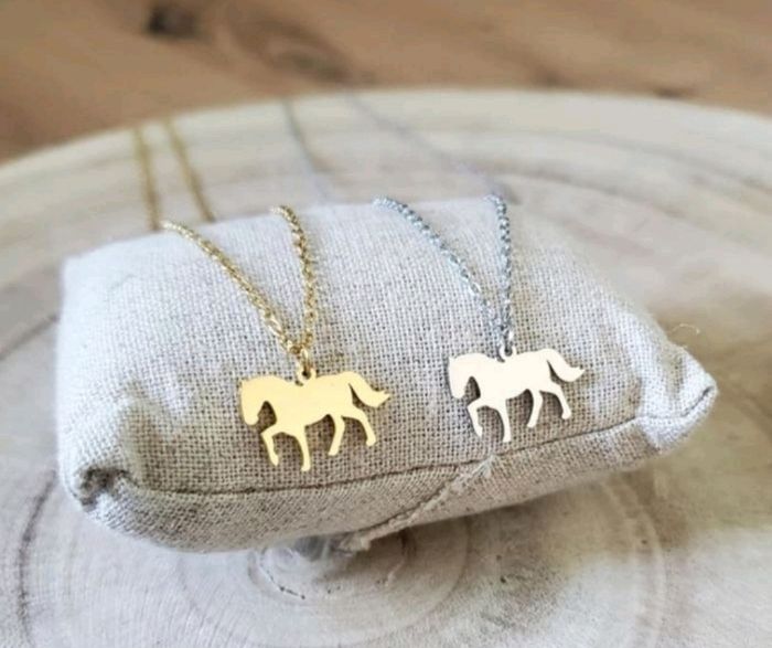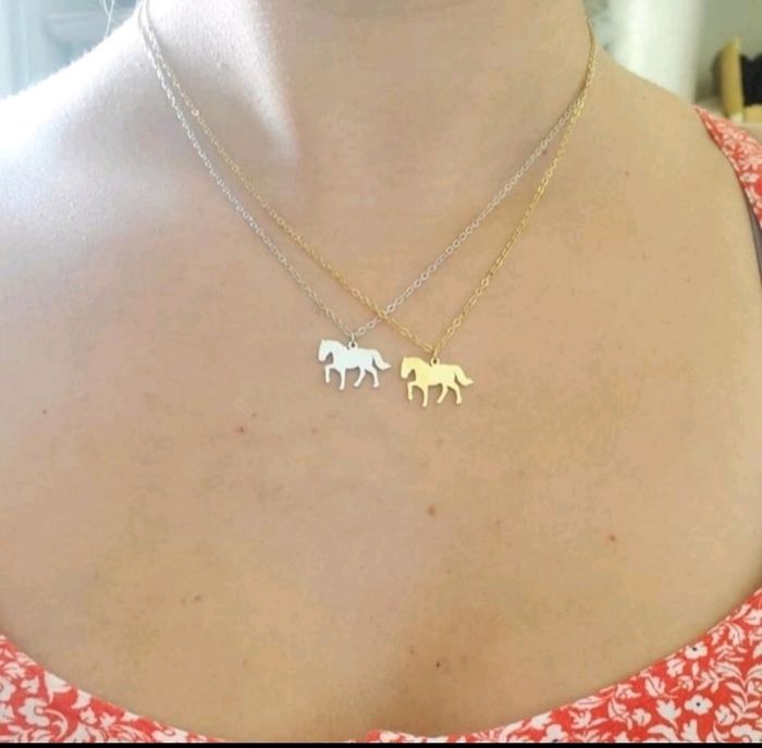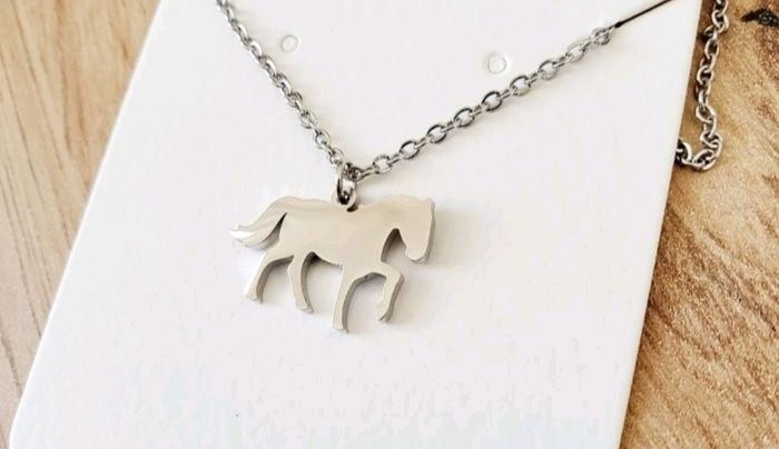 Collier pendentif cheval pour femme et homme pour les amoureux des chevaux, collier discret et élégant de 43,5 cm de longueur. Matière: acier inoxydable. Couleur argent.