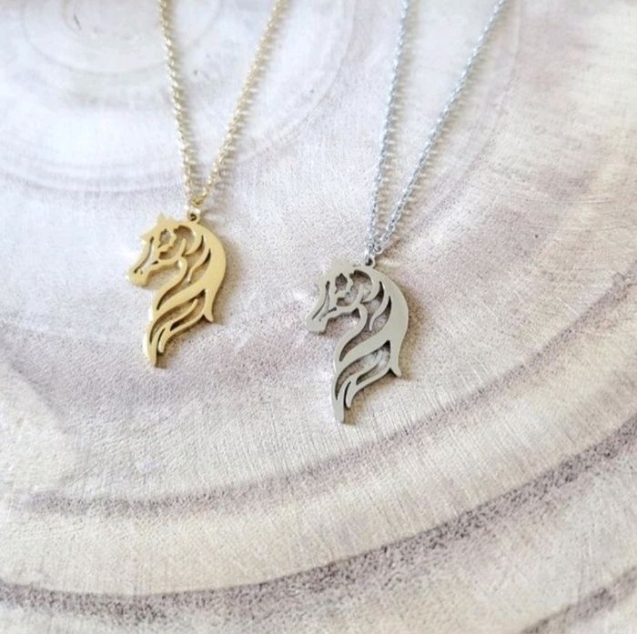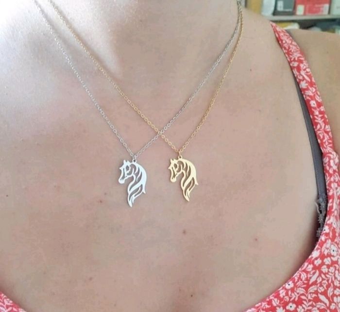 Collier chaine et pendentif joli cheval pour femme et homme pendentif amoureux des chevaux, collier discret et élégant de 43,5 cm de longueur. Pendentif de 2,5 cm de long et 1,5 cm de large. Matière: acier inoxydable. Couleur argent.