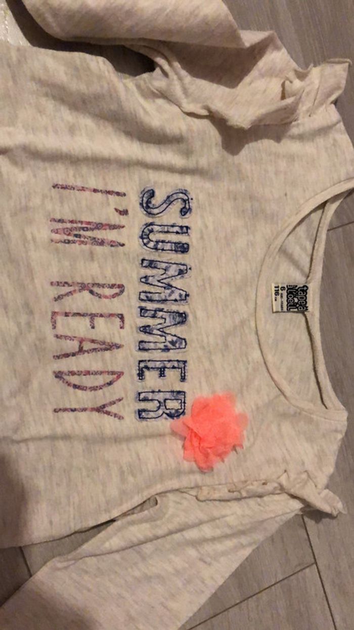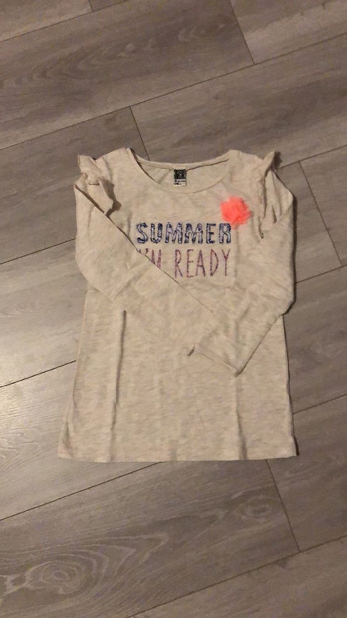 Jolie tunique fille Tape à l œil, couleur beige chiné, manches longues. Volants décoratifs sur les épaules et inscription sur le devant.