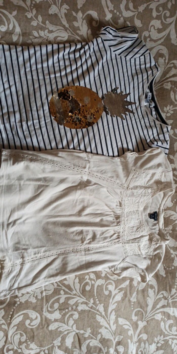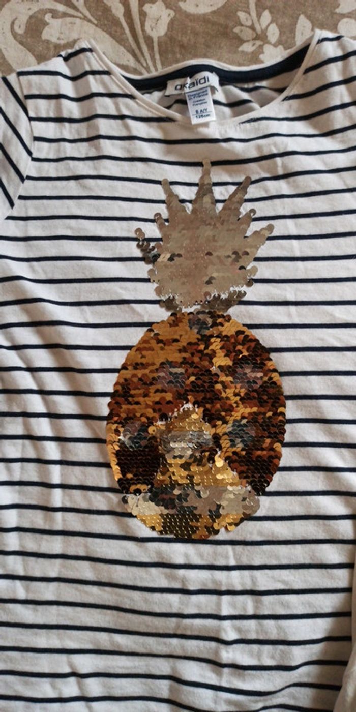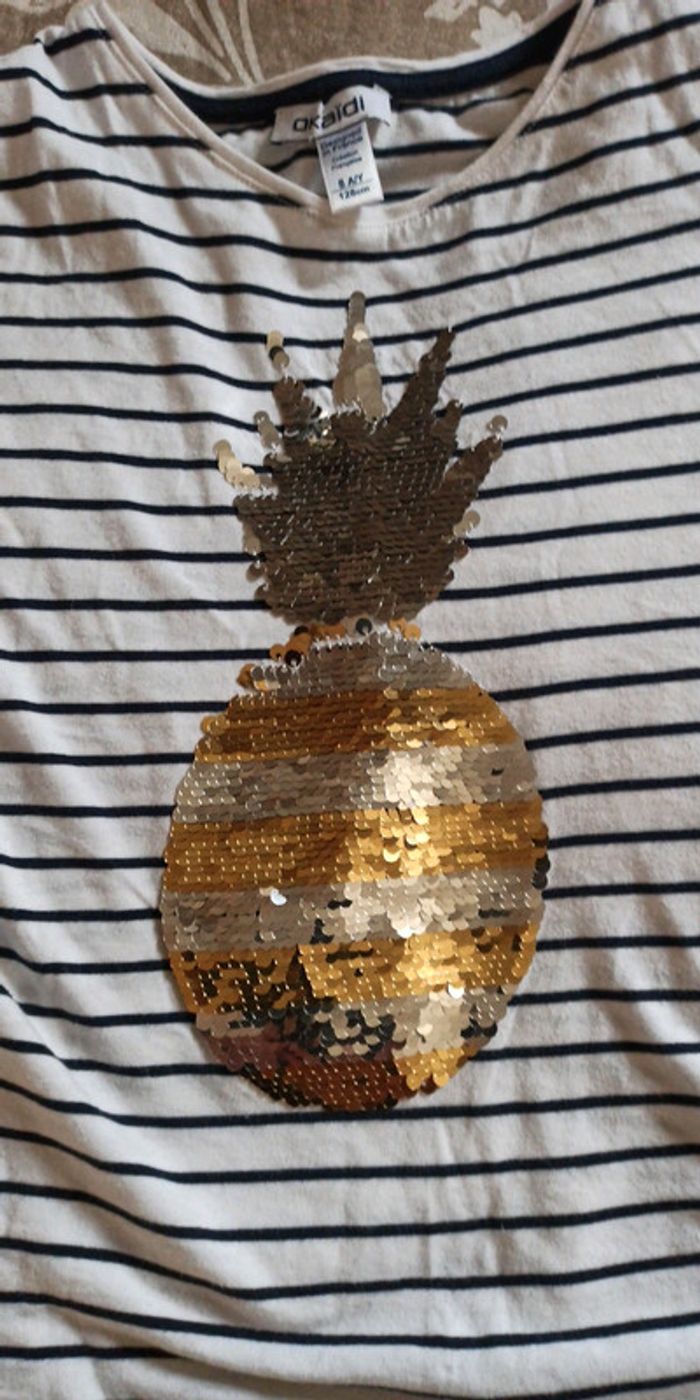 Lot de 2 t-shirts - 1 t-shirt Okaïdi style marinière avec ananas, sequins réversibles - 1 t-shirt Kiabi blanc, une petite tache voir photo Très bon état
