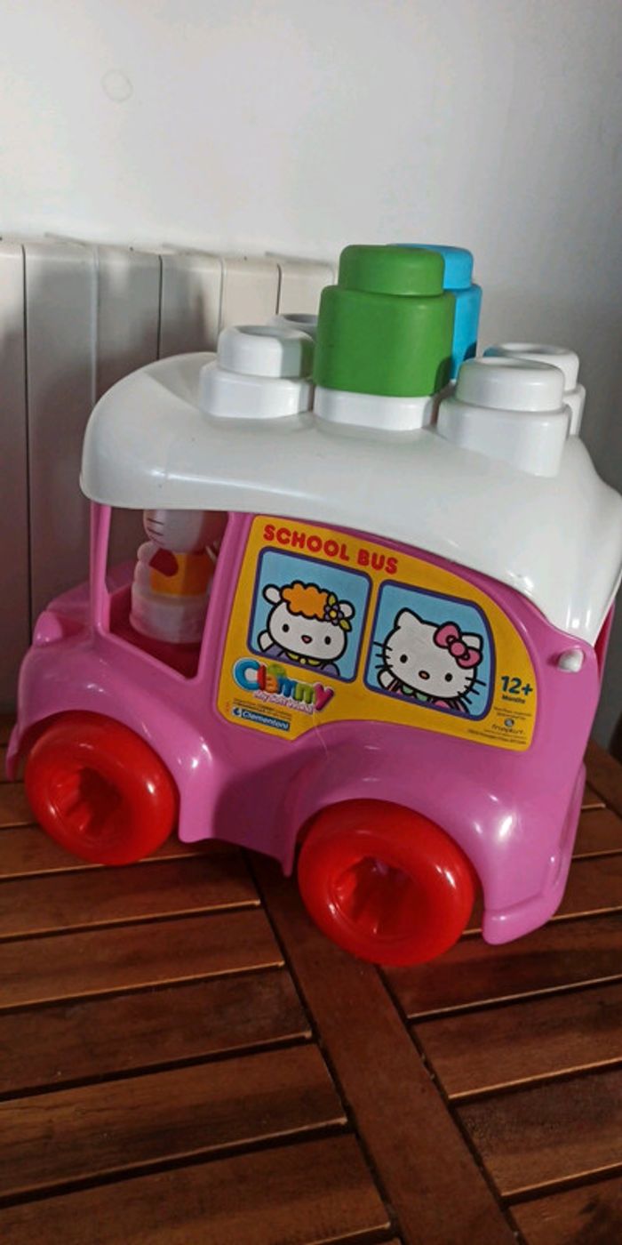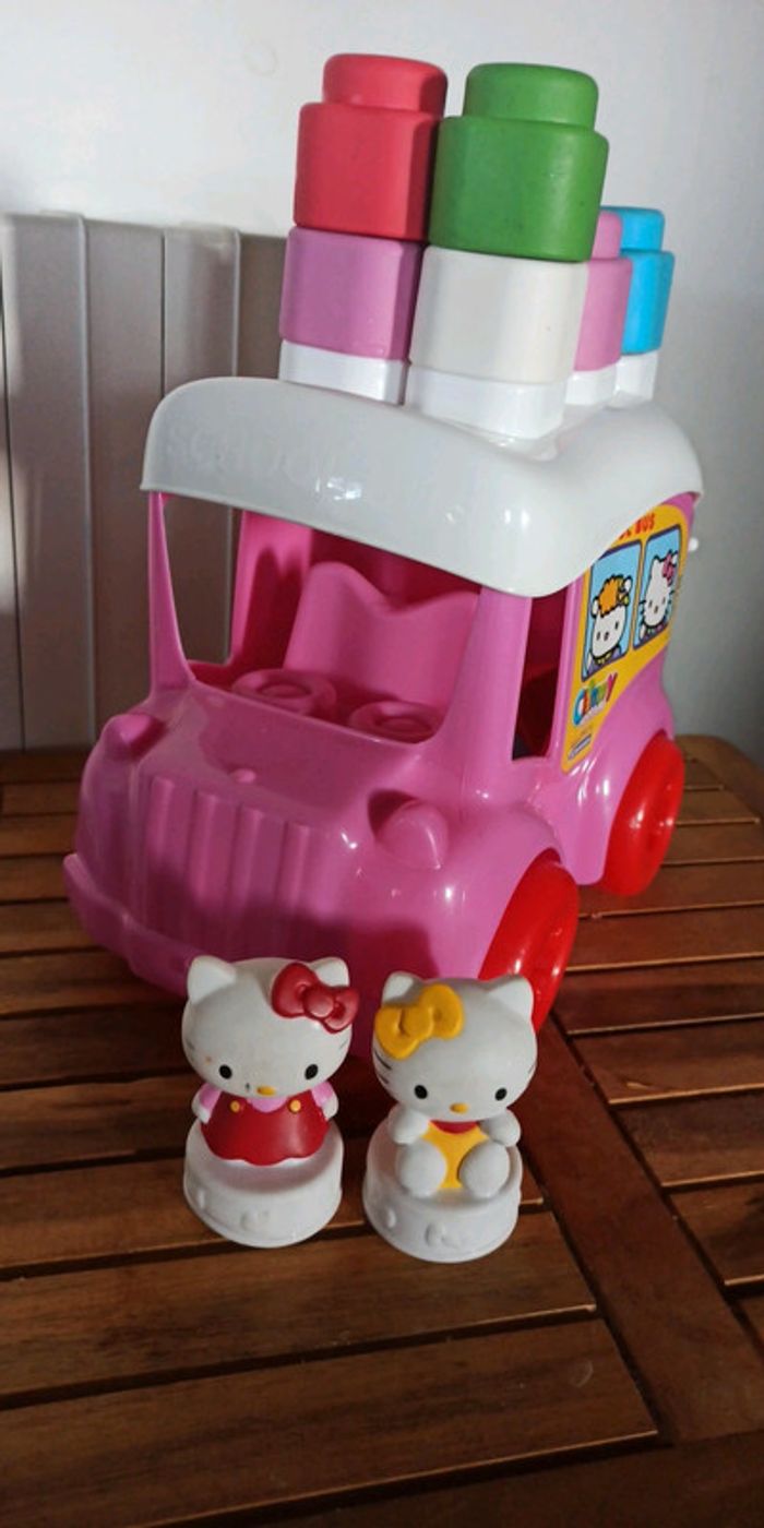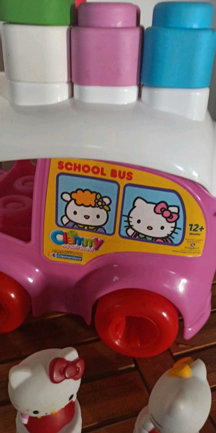 Dans le bus scolaire de Hello Kitty vous trouvez 10 briques souples et 2 personnages. Jouez à faire voyager Hello Kitty et ses amis. Le toit peut être ouvert, en se transformant aussi en pratique récipient. Âge: à partir de 12 mois +