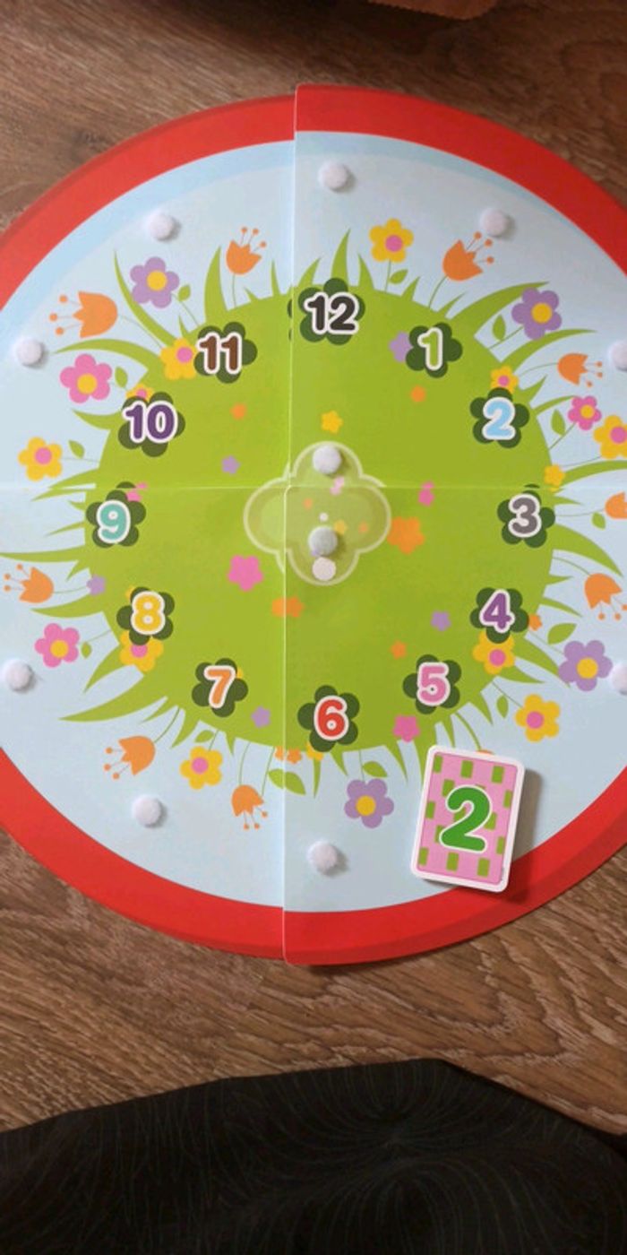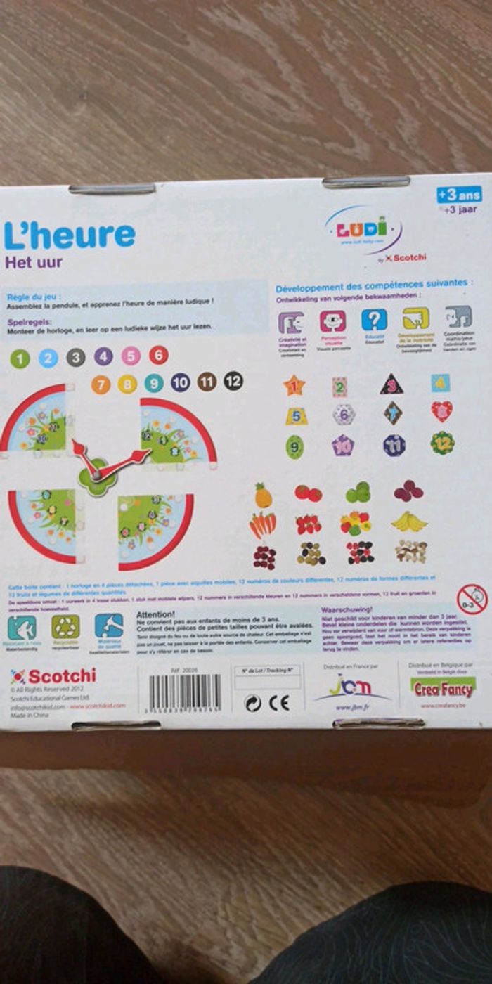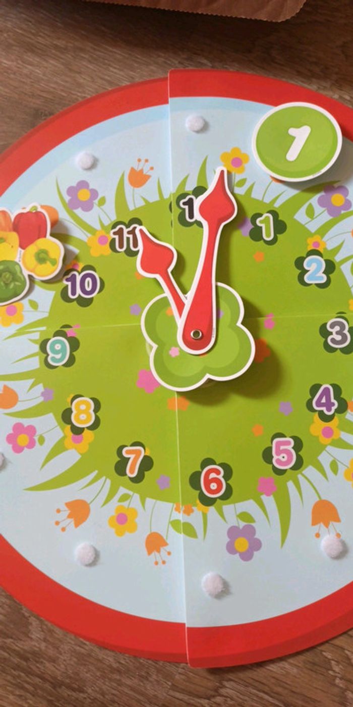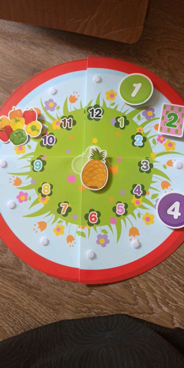 Jeu LUDI, apprentissage de l'heure Des 3 ans 1 horloge en 4 pièces, 1 pièce avec aiguilles mobiles, 12 numéros de couleurs différentes, 12 numéros de formes différentes, 12 fruits et légumes de différentes quantités Complet Très bon état