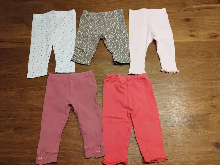 Lot de 5 leggings, taille 12 mois, en très bon état. Marques Cadet Rousselle, la Redoute Baby, bout'chou, grain de blé.